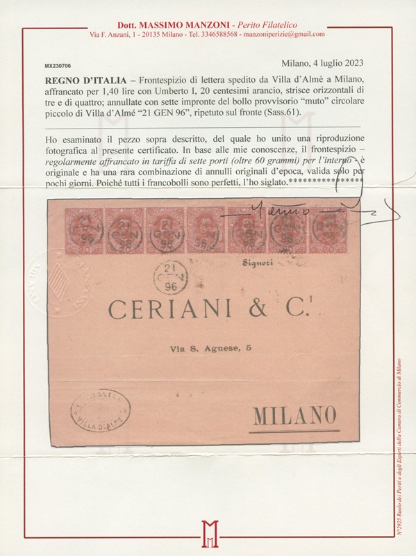 1896 - Umberto, 20c arancio, ST4 e ST3 (in origine parte della medesima ST7) annullati con muto circolare piccolo di Villa D'Alme' (BG) il '21 GEN 96', su frontespizio di lettera per Milano. Rarissimo uso del bollo provvisorio di Villa d'Alme', usato solo per pochi giorni. CF Manzoni (Sassone 61 - Euro - )