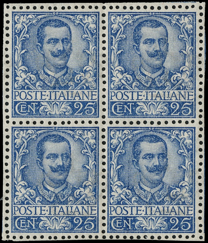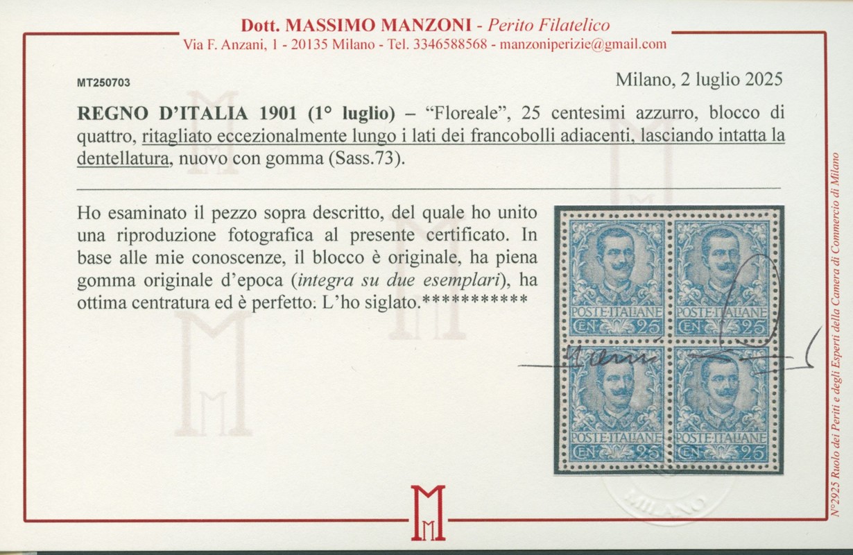 1901 - Floreale, 25c azzurro BL4 con i bordi degli esemplari adiacenti sui quattro lati, due SL e due TL, ottima centratura. Firma Giulio Bolaffi, CF Manzoni (Sassone 73 - Euro 14.000++)