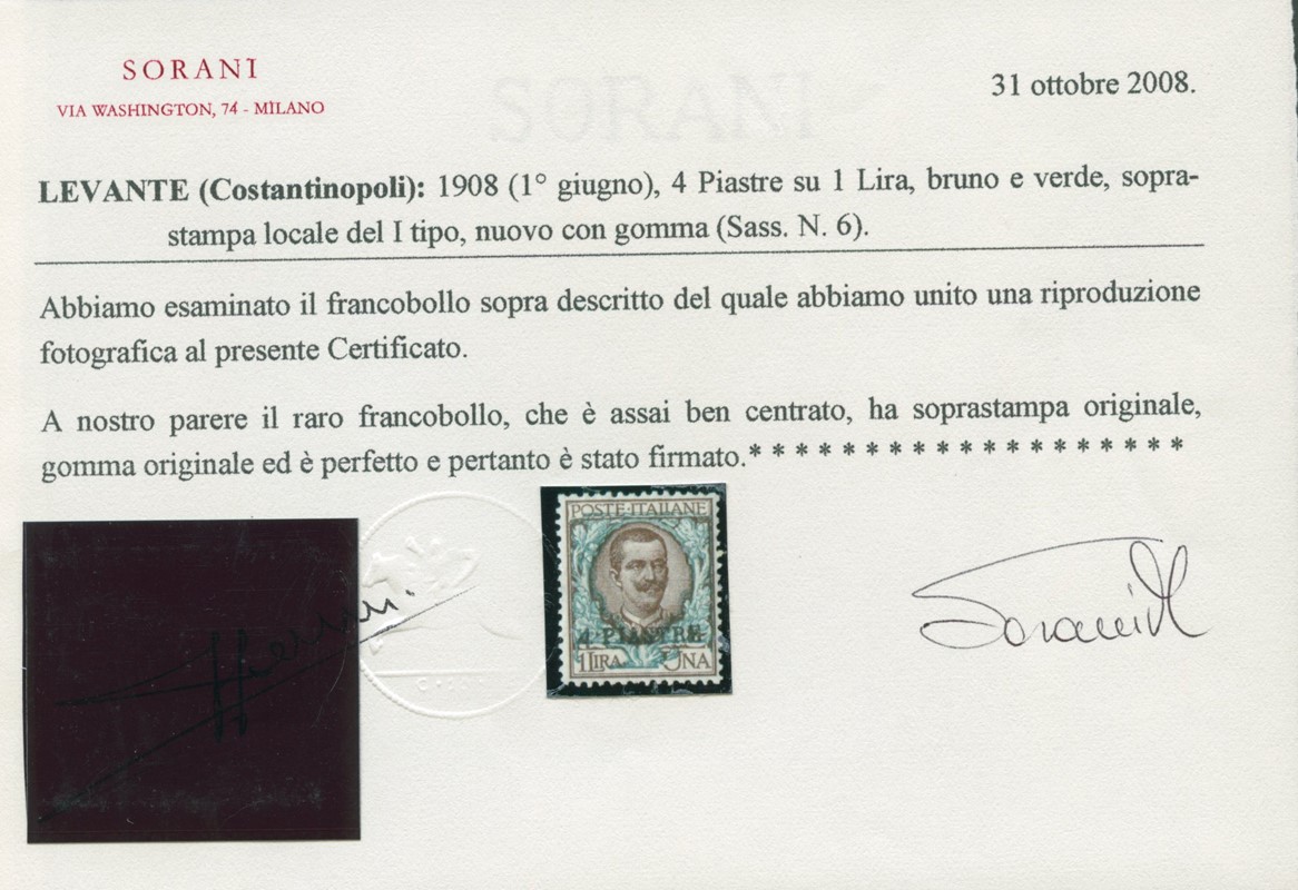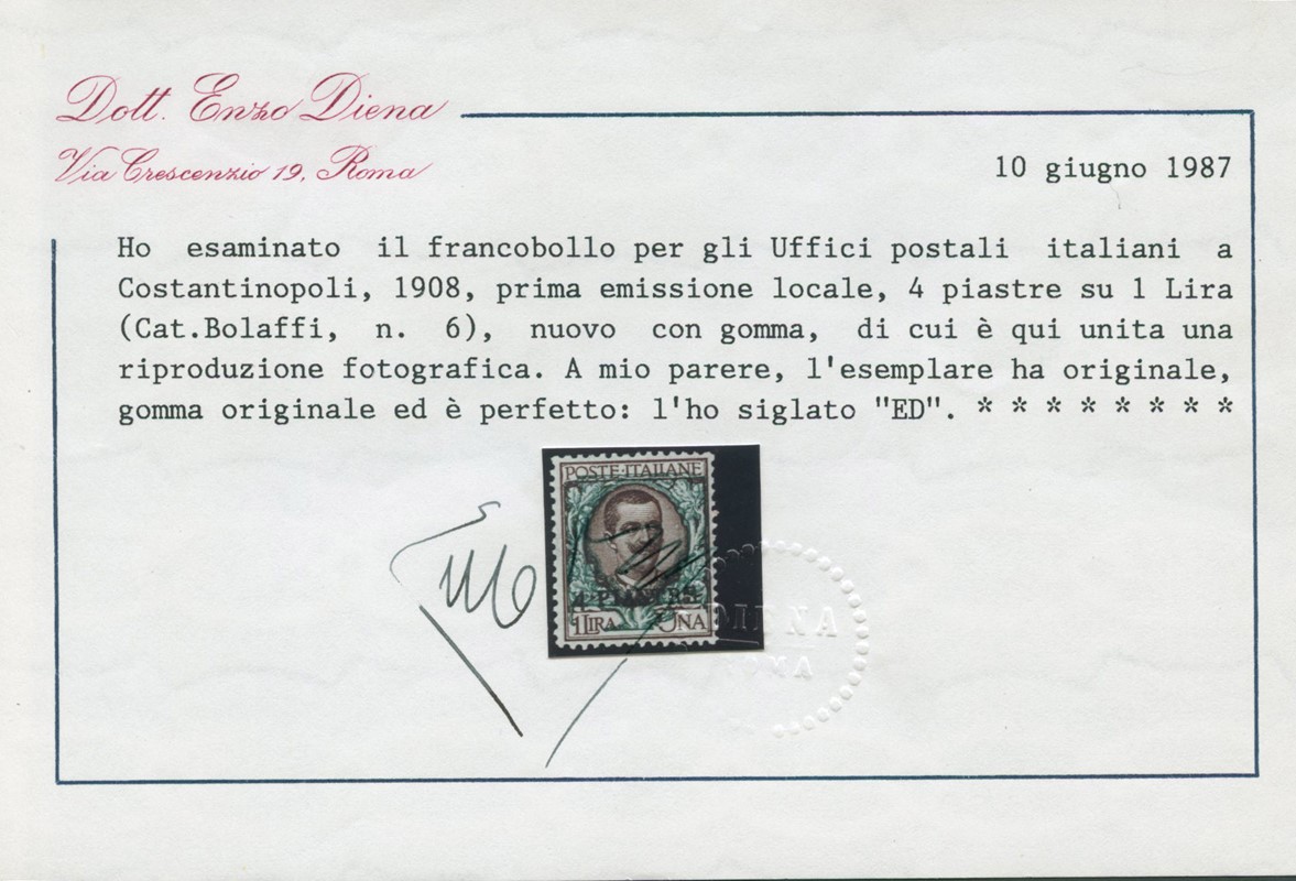 1906 - Costantinopoli: Floreale 1L bruno e verde con soprastampa '4 PIASTRE' locale del I tipo. Ben centrato e molto raro. CF E.Diena e Sorani (Sassone 6 - 30.000)