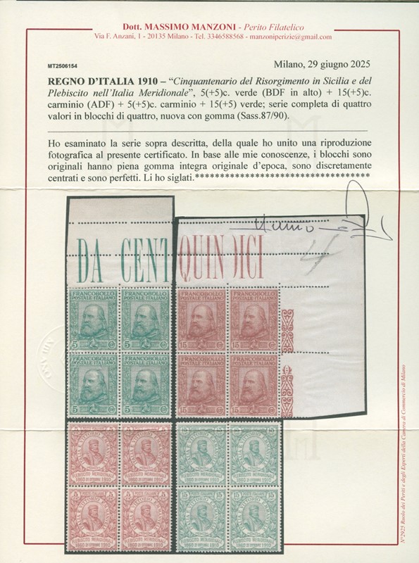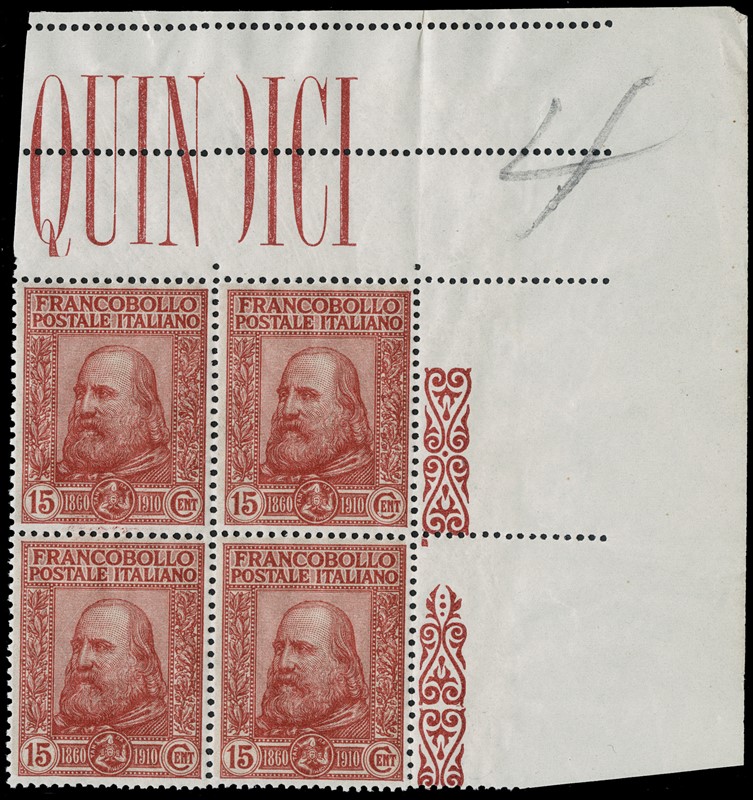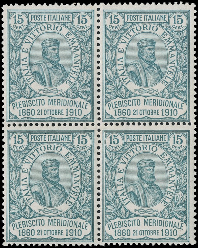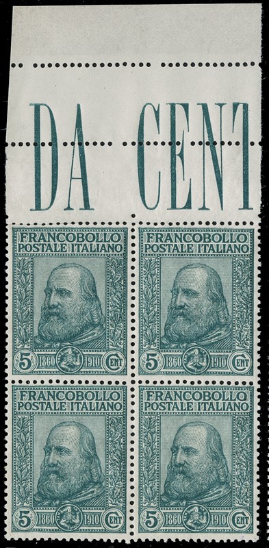 1910 - Garibaldi, la serie completa di quattro valori in BL4, discreta/buona centratura. CF Manzoni (Sassone 87/90 - Euro 10.400+)