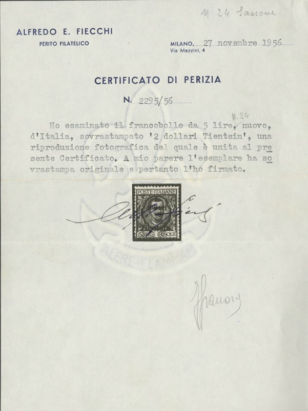 1917 - Tientsin: Floreale 5L oltremare e rosa soprastampato '2 dollari Tientsin'. Raro, CF Fiecchi (Sassone 24 - Euro 35.000)