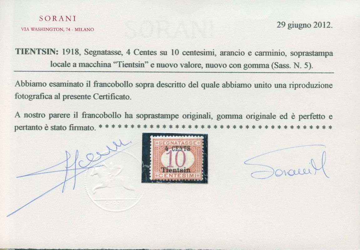 1917 - Tientsin: segnatasse 10c arancio e carminio soprastampato '4 CENTS TIENTSIN', con soprastampa locale a macchina. Raro, CF Sorani (Sassone T5 - Euro 18.000)
