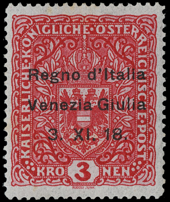 1918 - Venezia Giulia: 3kr rosa carminio, carta senza fili di seta, con soprastampa tipografica. TL leggera, splendido (Sassone 16/I - Euro 12.000)