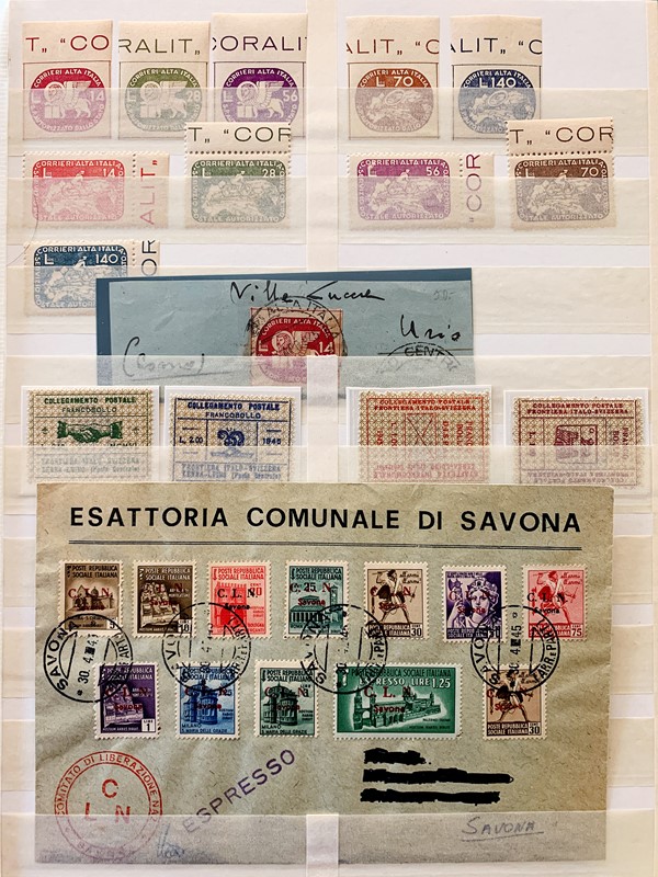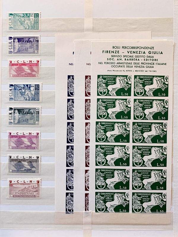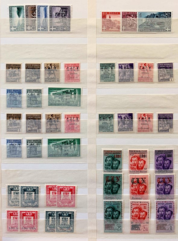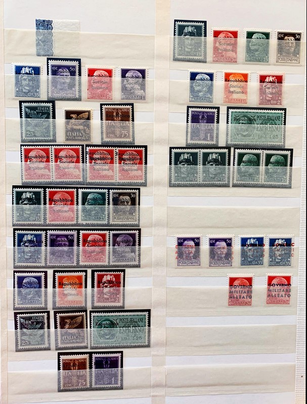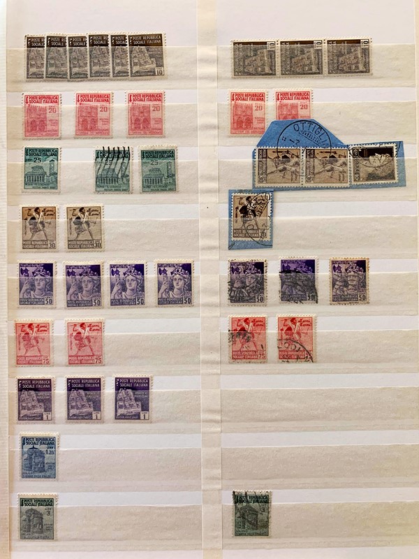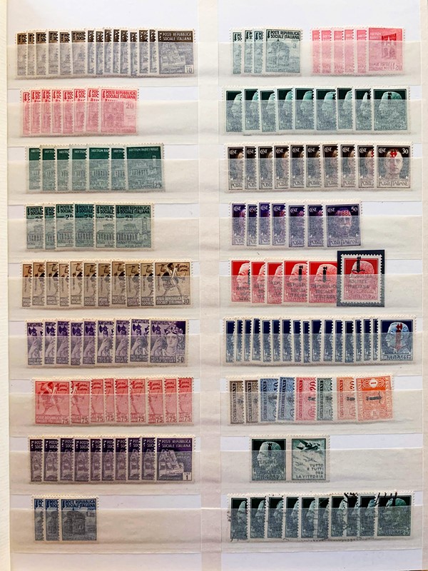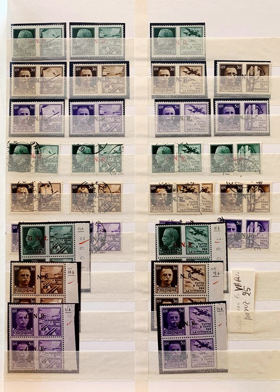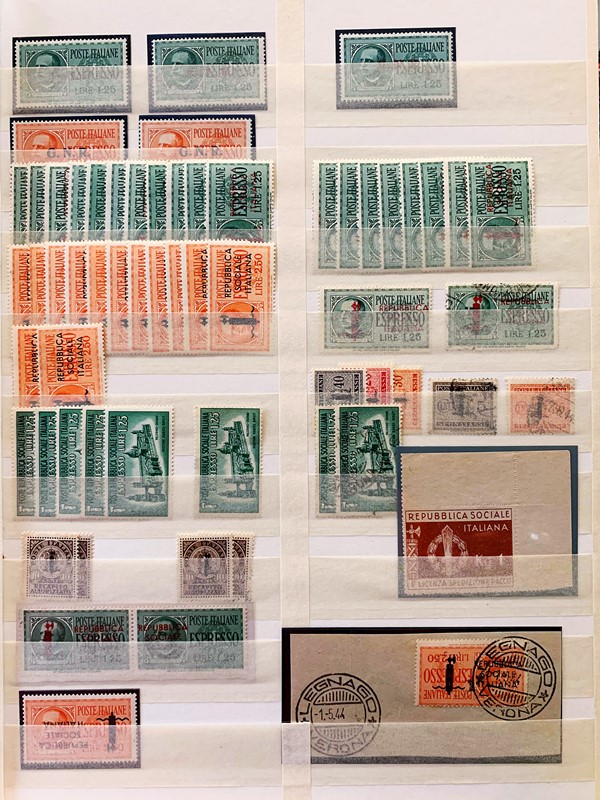 1918/44 - REGNO D'ITALIA - RSI: insieme di diverse centinaia di francobolli, nuovi e usati, delle varie emissioni di GNR, RSI, CLN e di alcune occupazioni italiane (Trentino, Venezia Giulia, Albania, Montenegro, Lubiana, Litorale Sloveno). Notate interessanti presenze e alcune ripetizioni. Insieme di qualita' mista. Alto valore di catalogo. Un classificatore