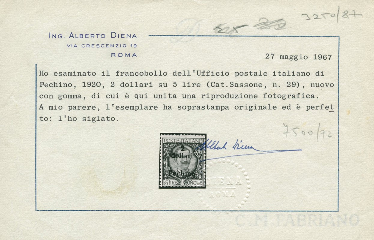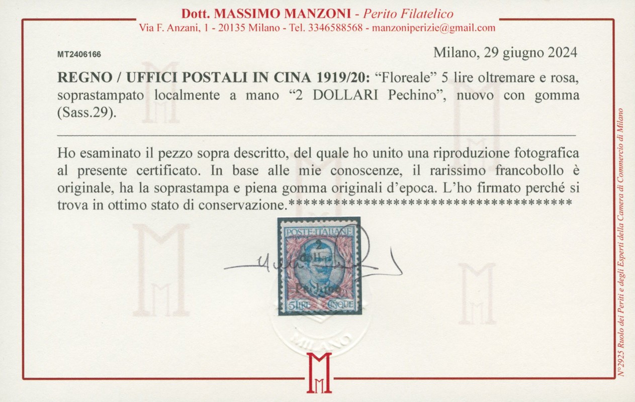 1919/20 - Pechino: 2d su 5L oltremare e rosa con soprastampa locale di tipo diverso '2 dollari Pechino'. Raro, firma Em.Diena e CF A.Diena e Manzoni 'ottimo stato' (Sassone 29 - Euro 35.000)