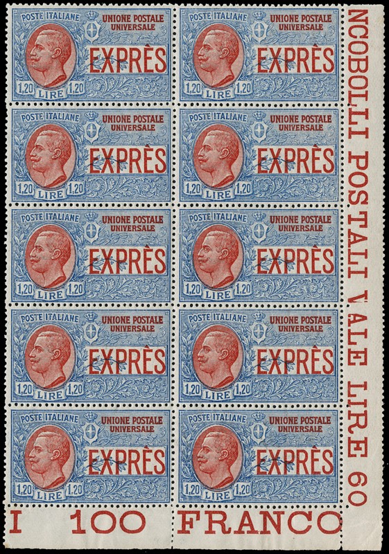 1922 - Espressi, 1,20L azzurro e rosso non emesso, BL10 AdF, ottima centratura (Sassone E8 - Euro 8.000/24.000+)