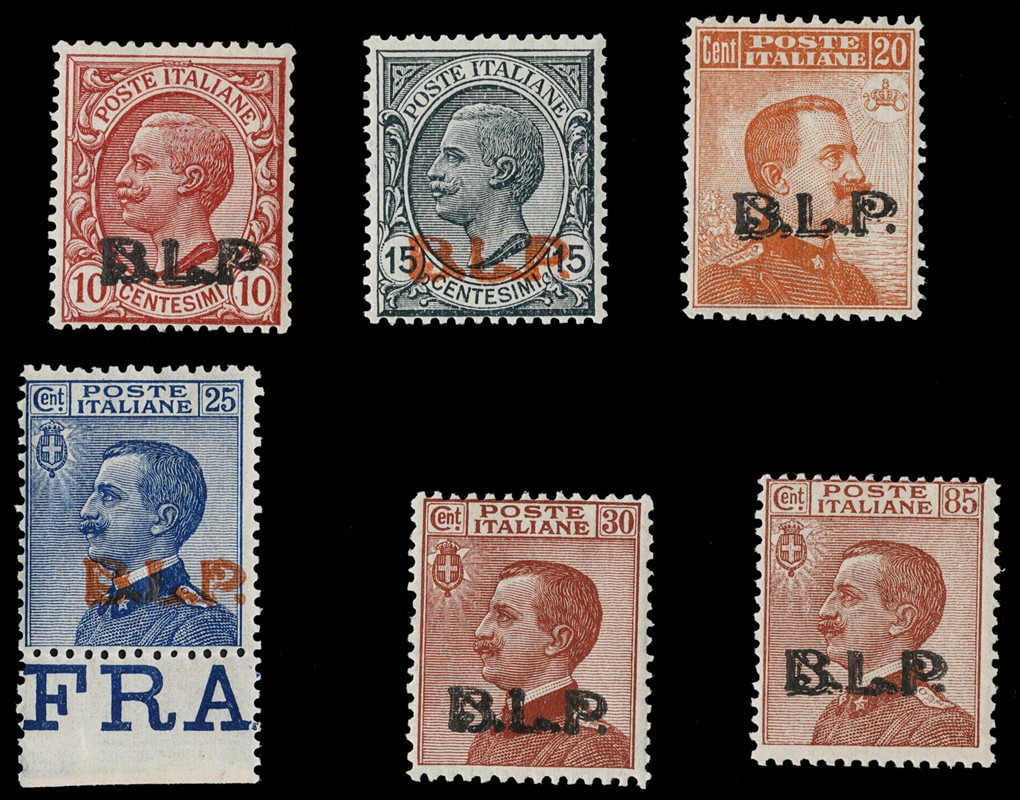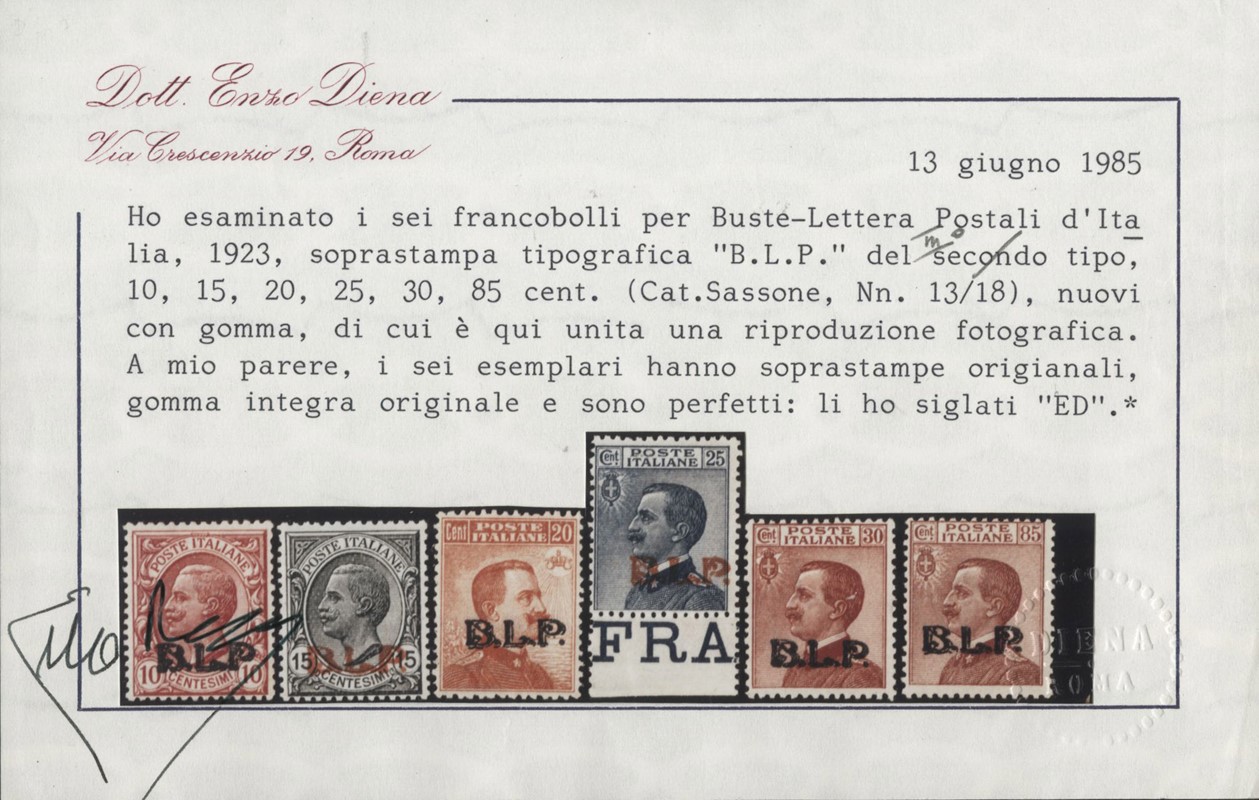 1923 - BLP soprastampa litografica III tipo, 10c rosa, 15c grigio (Ar), 20c arancio, 25c azzurro (Ar) BdF, 30c bruno arancio, 85c bruno rosso, tutti SL, discreta centratura. CF E.Diena (Sassone BLP13/18 - Euro 7.025)