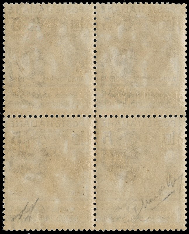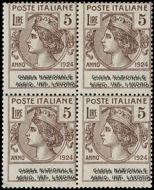 1924 - Enti Parastatali: 5L bruno scuro 'CASSA NAZIONALE ASSIC. INF. LAVORO' con doppia stampa della dicitura dell'Ente, BL4 (Sassone 23a - Euro 3.600+)