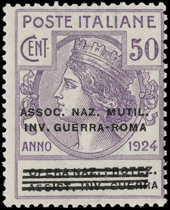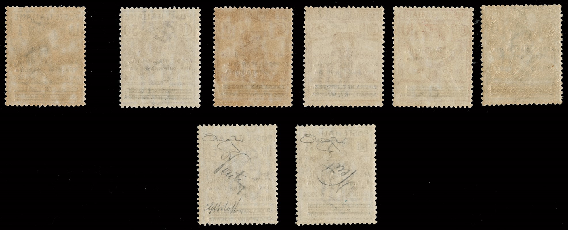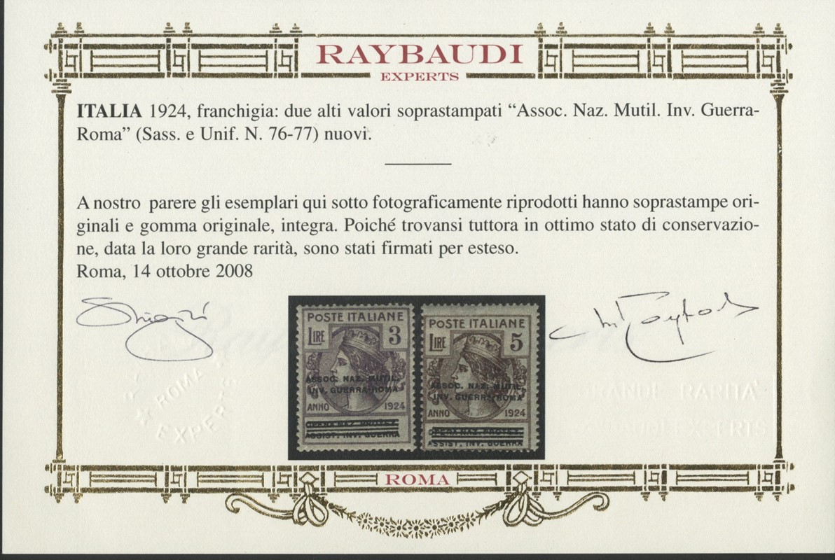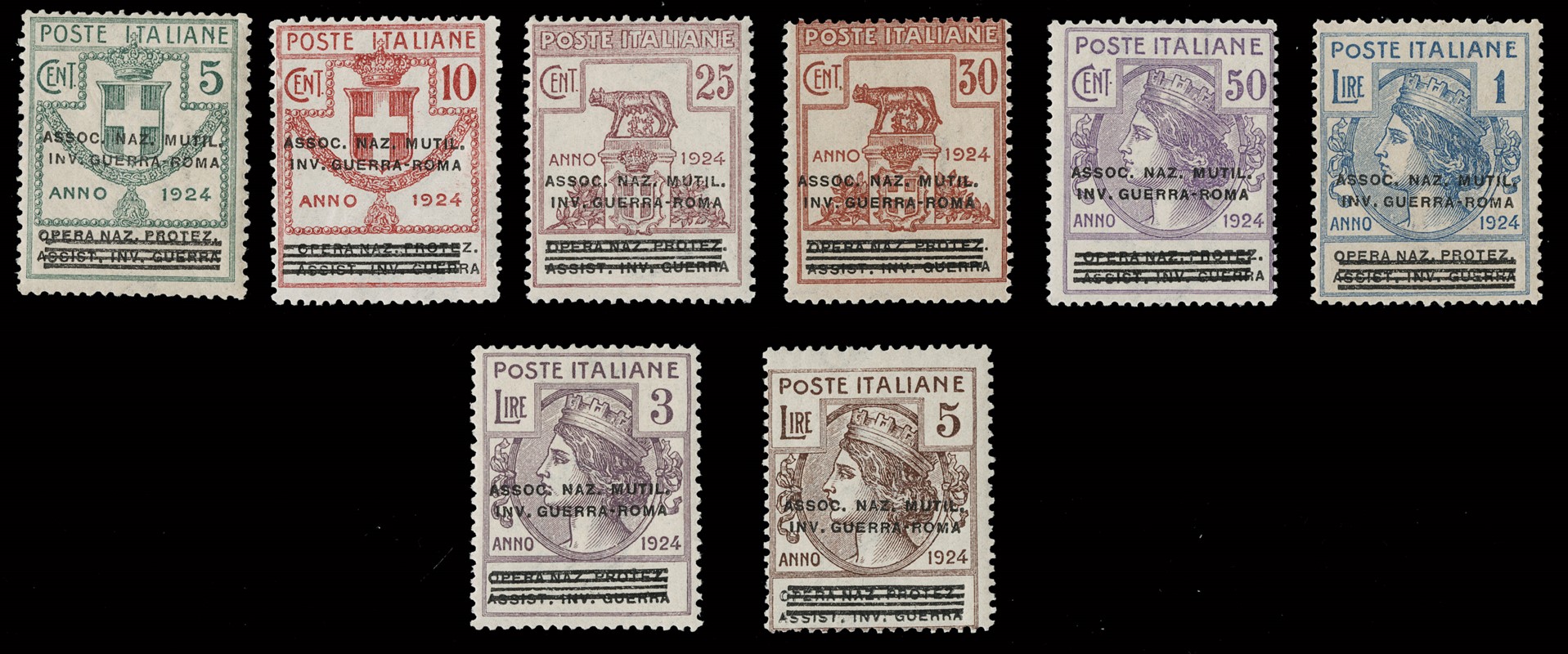 1924 - Enti Parastatali, ASSOC. NAZ. MUTIL. INV. GUERRA - ROMA, la serie completa di otto valori, tutti SL. CF Raybaudi per i due alti valori, sigla Giulio Bolaffi per il 5L, CF Manzoni per il 3L lilla scuro e il 5L bruno scuro (Sassone 70/77 - Euro 16.000)