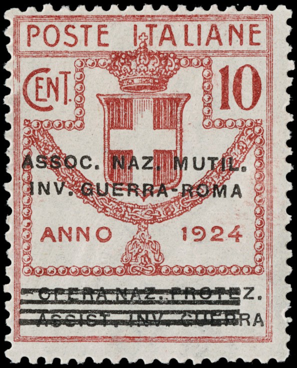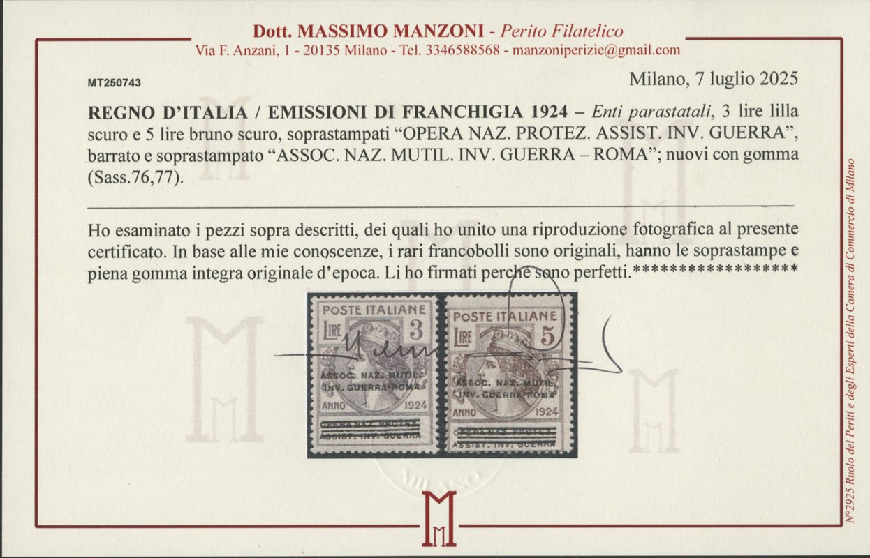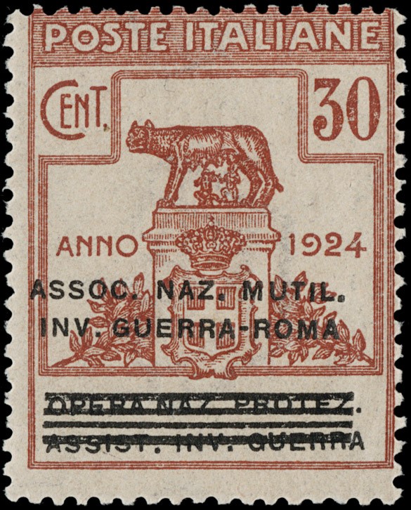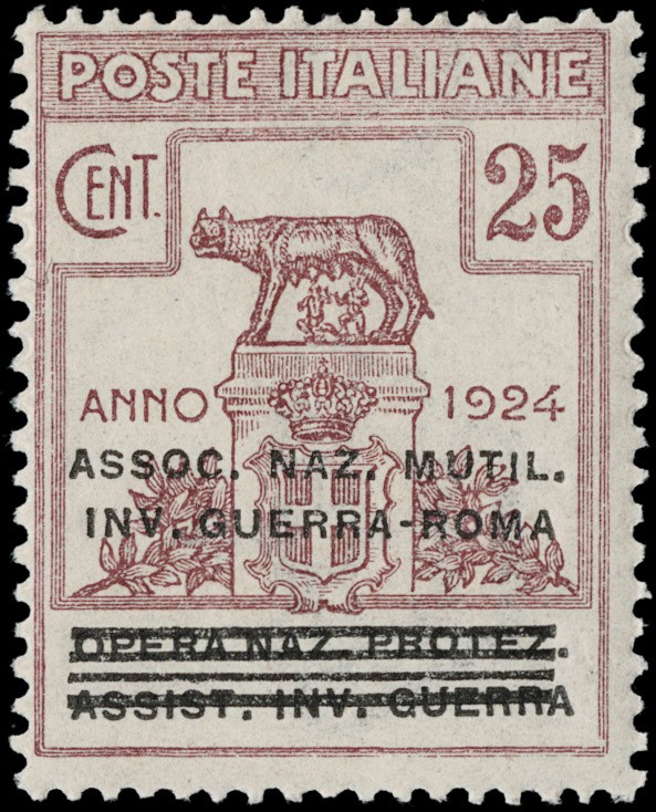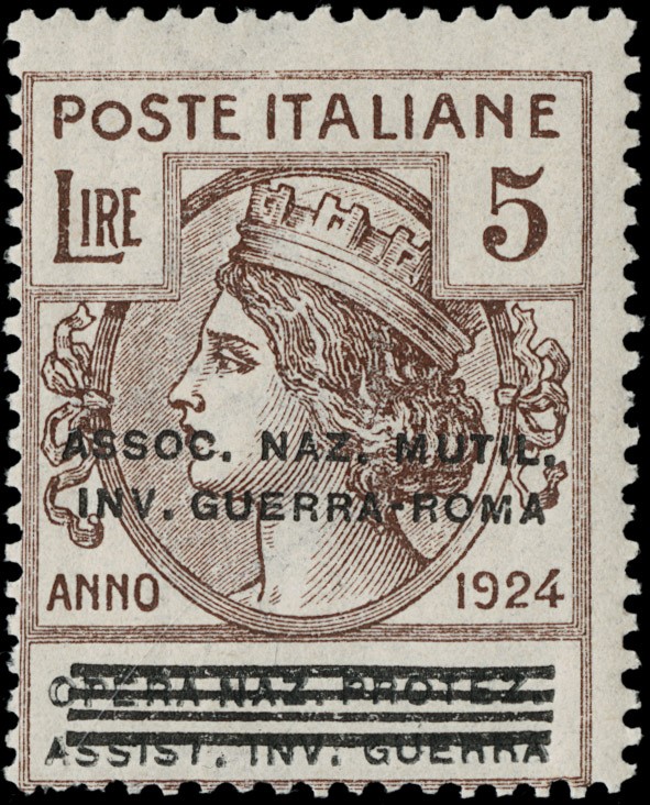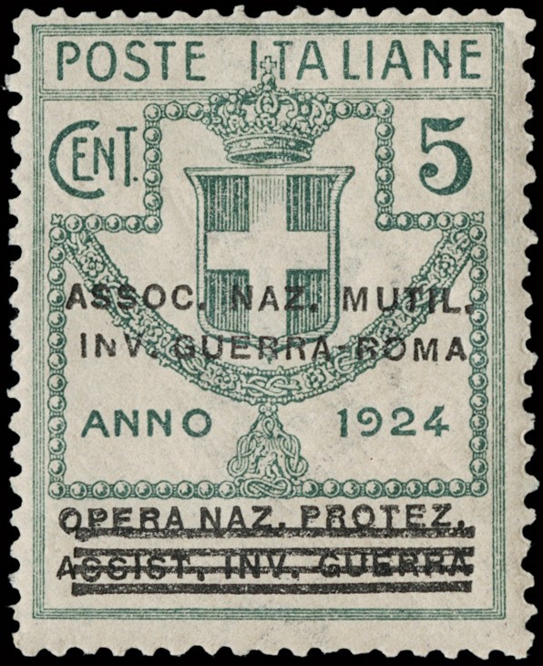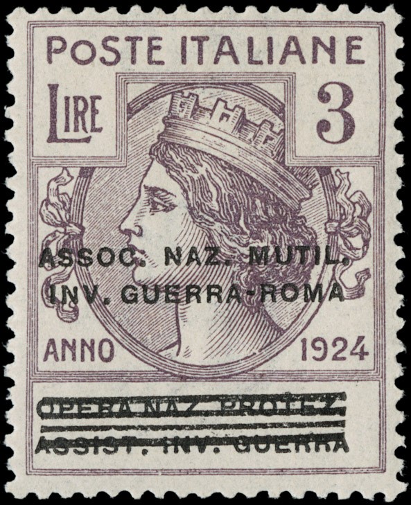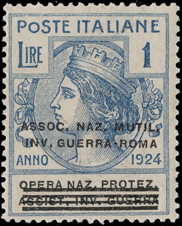 1924 - Enti Parastatali, ASSOC. NAZ. MUTIL. INV. GUERRA - ROMA, la serie completa di otto valori, tutti SL. CF Raybaudi per i due alti valori, sigla Giulio Bolaffi per il 5L, CF Manzoni per il 3L lilla scuro e il 5L bruno scuro (Sassone 70/77 - Euro 16.000)