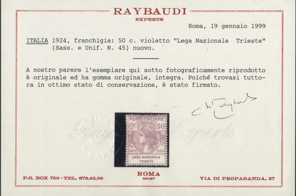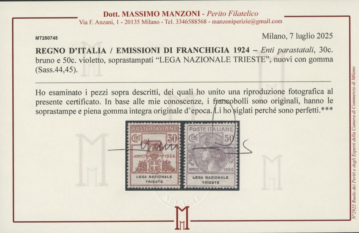 1924 - Enti Parastatali, Lega Nazionale Trieste, la serie completa di quattro valori, tutti SL. CF Raybaudi per il 50c violetto, CF Manzoni per il 30c bruno e il 50c violetto (Sassone 42/45 - Euro 4.500+)