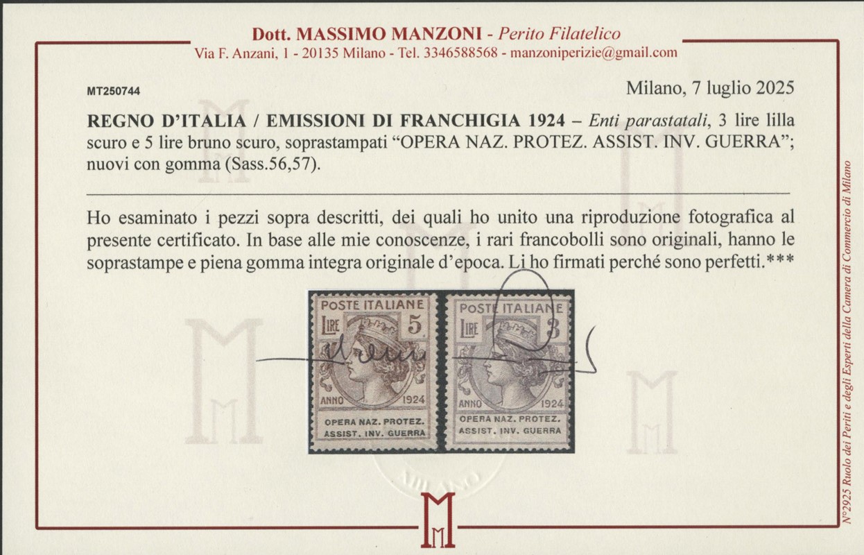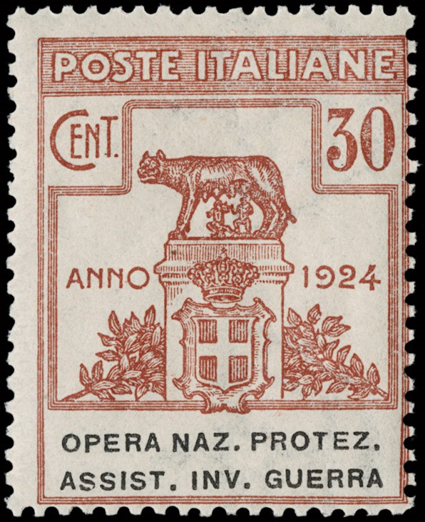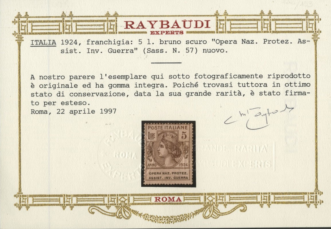 1924 - Enti Parastatali, Opera Naz. Protez. Assist. Inv. Guerra, la serie completa di otto valori, tutti SL. Sigla A.Diena e CF Raybaudi per il 5L bruno, CF Manzoni per il 3L lilla scuro e il 5L bruno scuro (Sassone 50/57 - Euro 65.500)