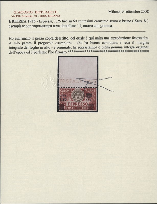 1925 - Eritrea: 1,25 su 60c carminio scuro e bruno, soprastampa nera, dent.11 con ampio BdF superiore. Splendido. Firma G. Bolaffi, CF Bottacchi (Sassone E8 - Euro 21.000)