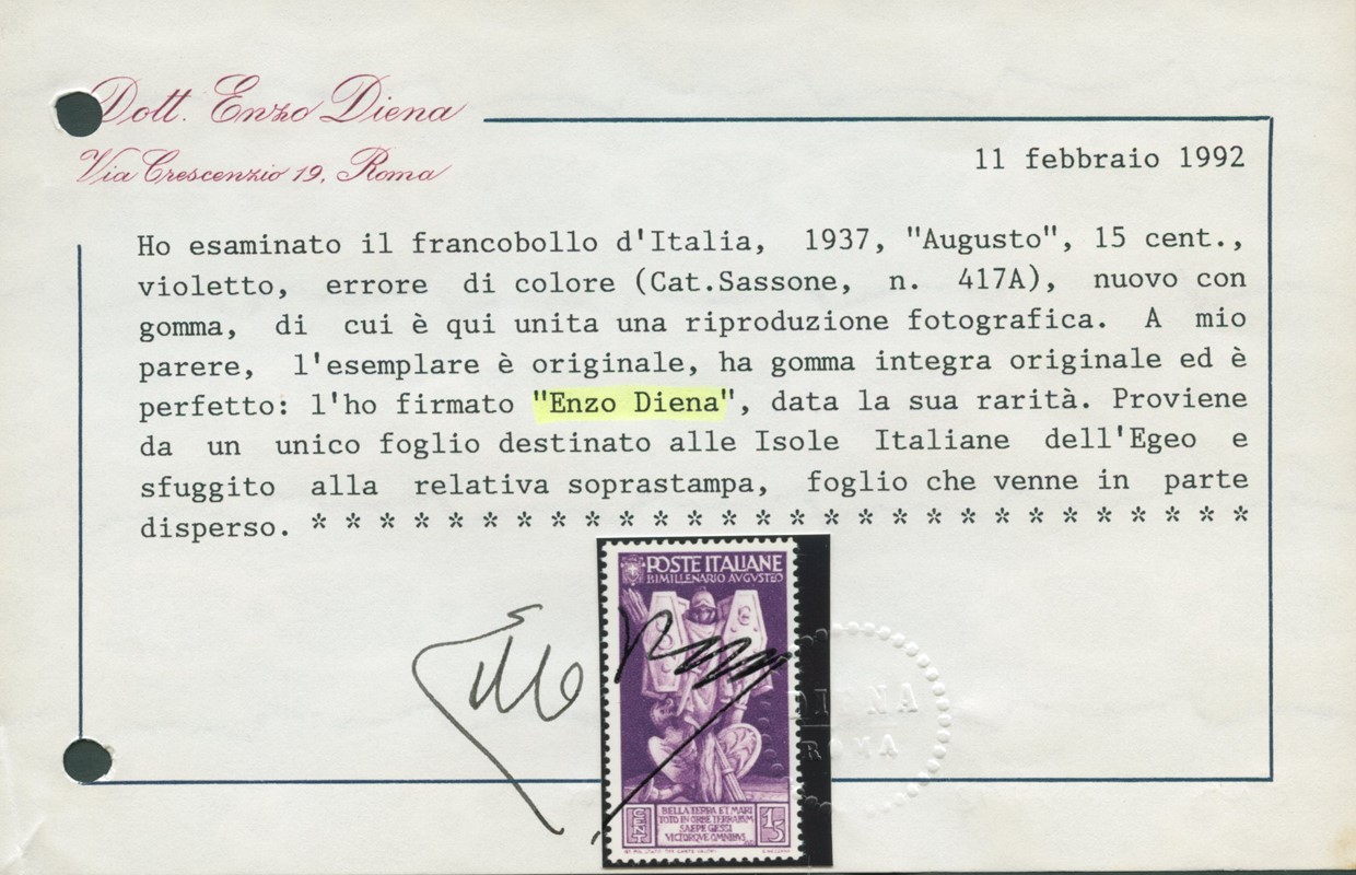 1927 - Augusto,15c violetto colore diverso, ben centrato. Proviene da un foglio unico destinato alle isole italiane dell'Egeo e sfuggito alla soprastampa, in parte disperso. Molto raro. CF E.Diena (Sassone 417A - Euro 97.500)