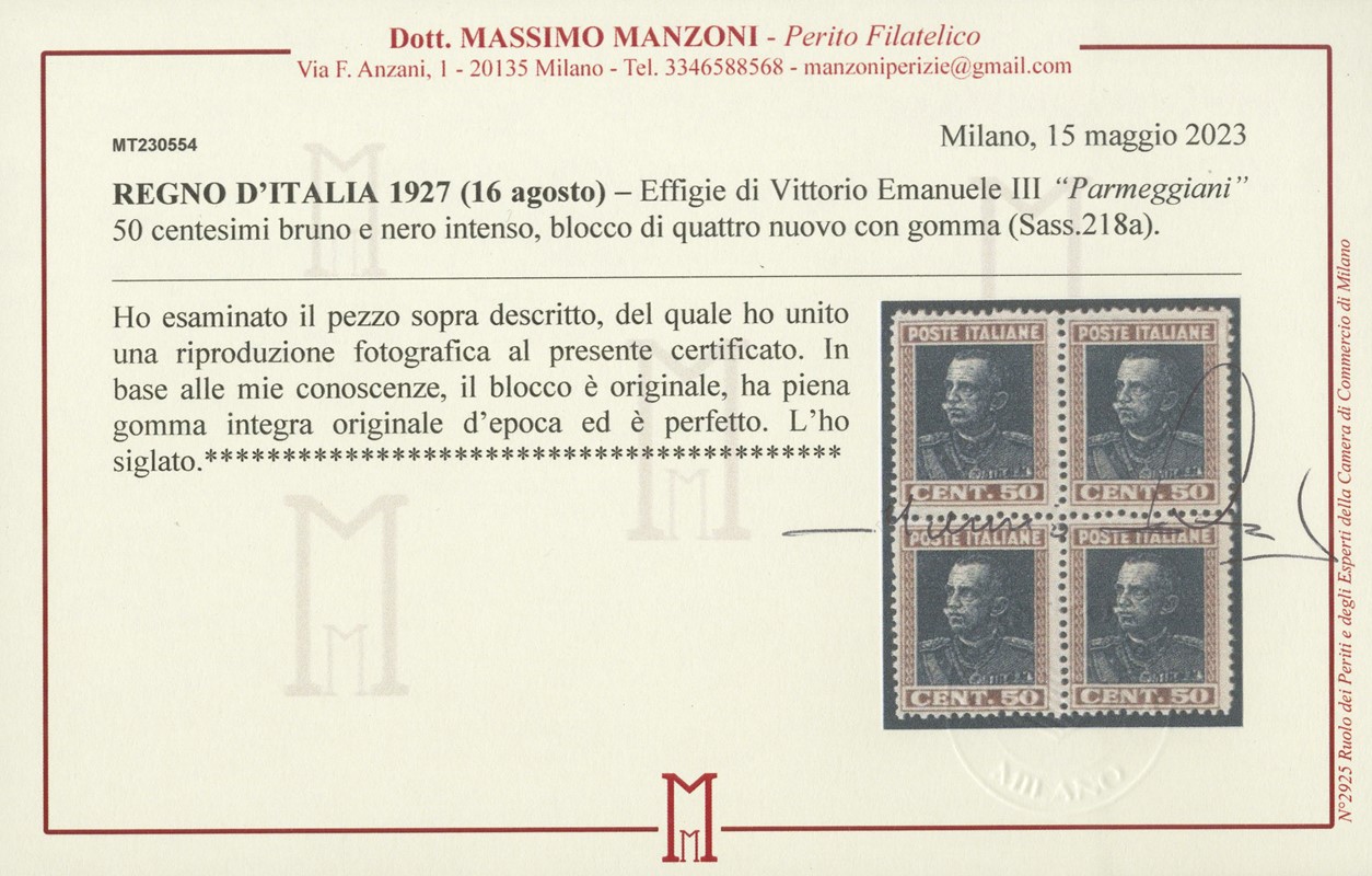 1927 - Vittorio Emanuele III, 50c bruno e nero intenso BL4, SL. CF Manzoni (Sassone 218a - Euro 6.600+)