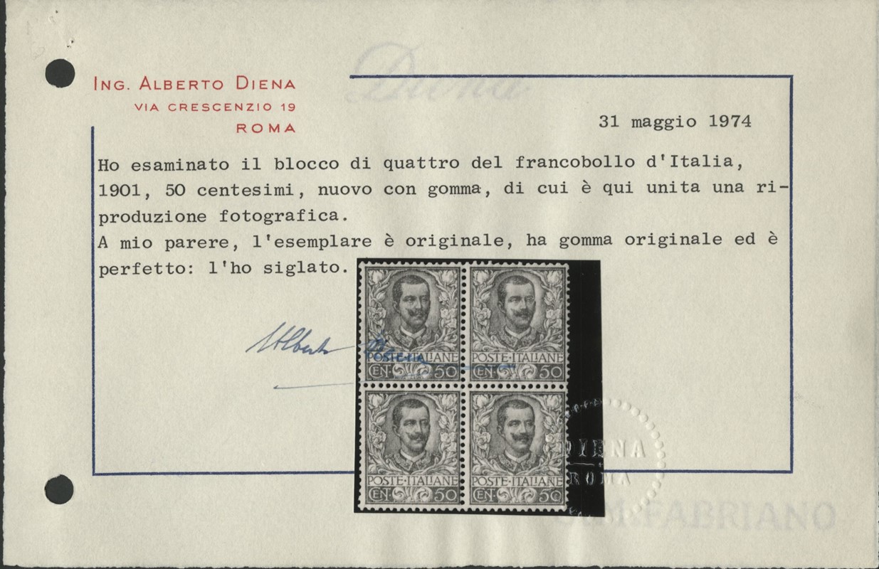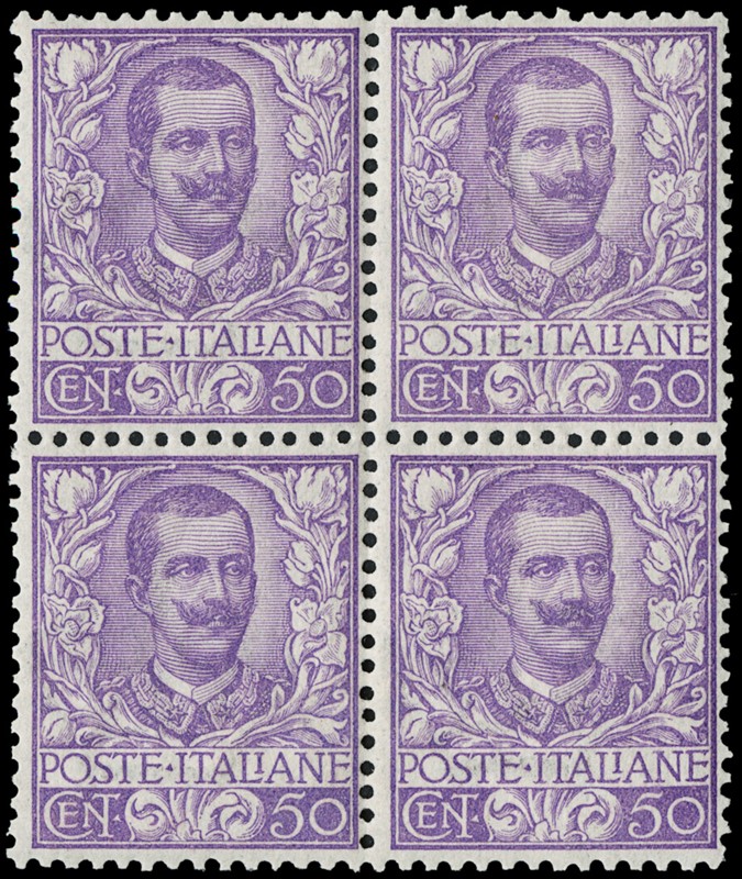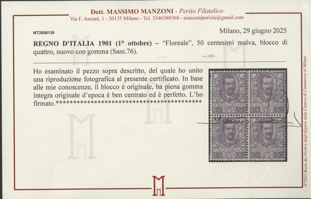 1929 - Floreale, 50c malva BL4 SL, buona/ottima centratura. CF A.Diena e Manzoni (Sassone 76 - Euro 16.500/42.000+)