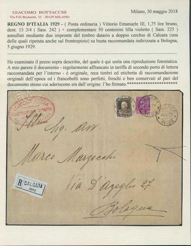 1929 - Vittorio Emanuele III, 1,75L bruno dent.13 3/4 e 50c violetto, su busta raccomandata da 'CALCARA 5 GIUGNO 1929' a Bologna. Rara affrancatura. CF Bottacchi (Sassone 225+242 - Euro 19.500)