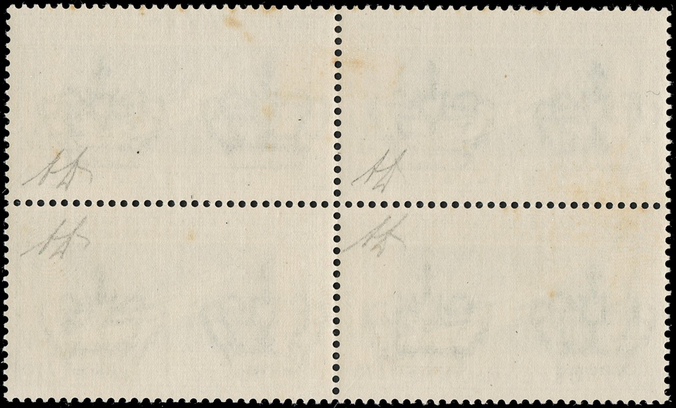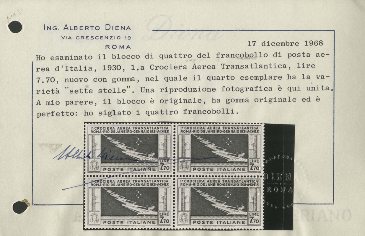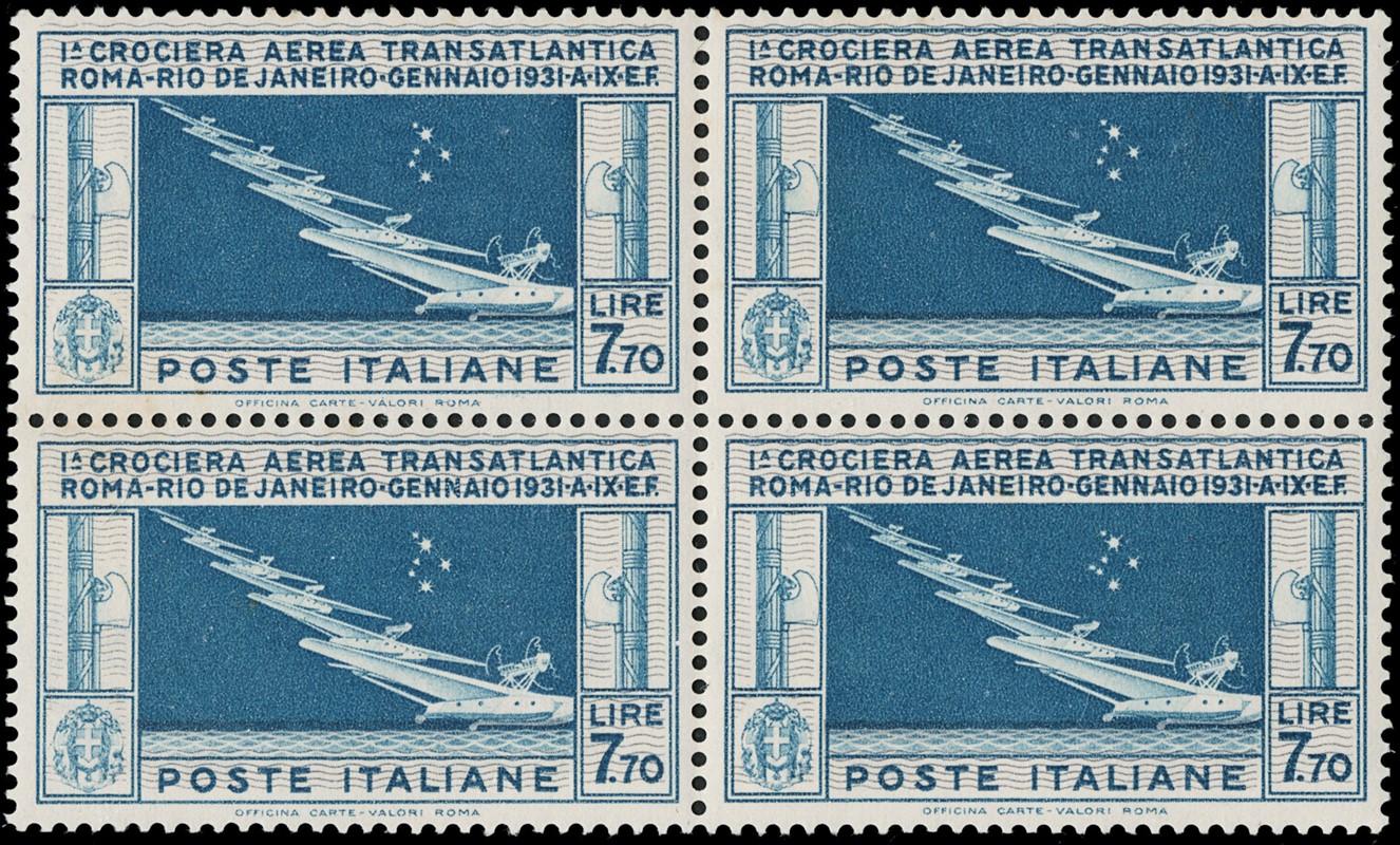 1930 - Balbo, 7,70L celeste e grigio, BL4, esemplare in basso a destra con varieta' 'sette stelle'. Esemplari inferiori (compreso il 7 stelle) SL, i superiori TL. Qualche minimo punto di ruggine. CF A.Diena (Sassone PA25+25a - Euro 8.300+1.300)