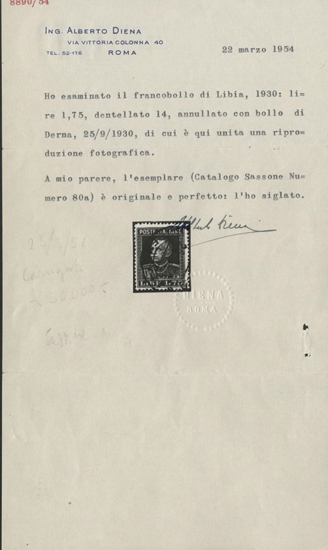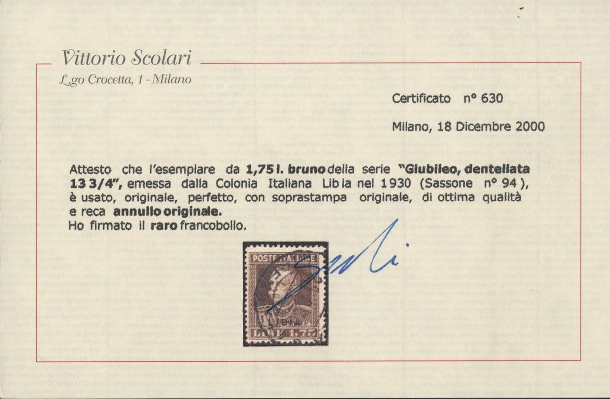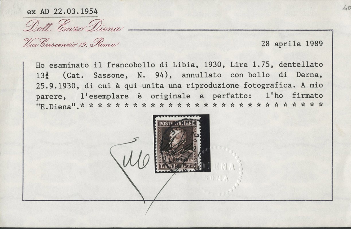 1930 - Libia: Giubileo, 1,75L bruno dent.13 3/4 annullato 'DERNA 25.9.30'. CF A.Diena, E.Diena e Scolari (Sassone 94 - Euro 25.000)