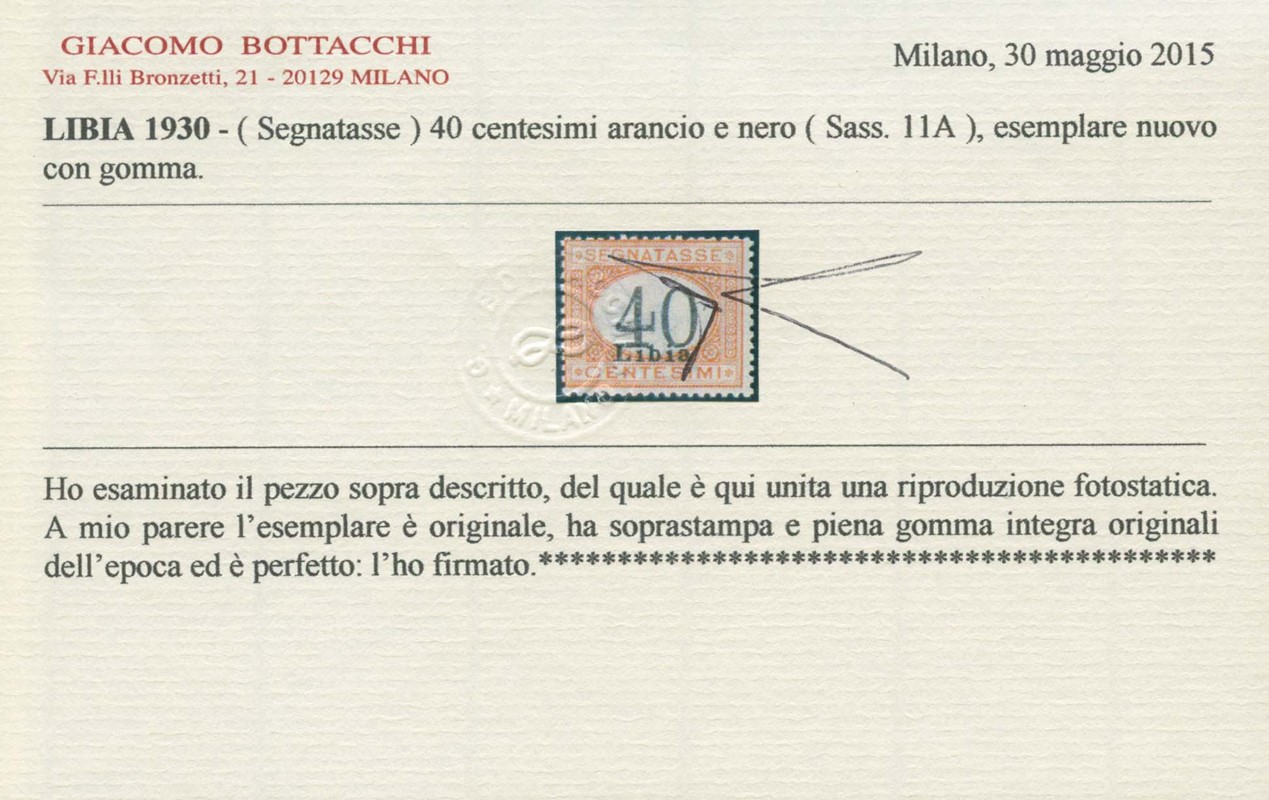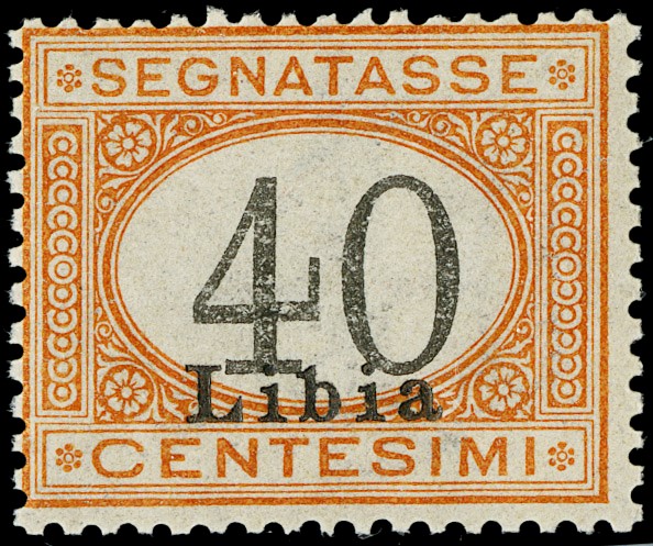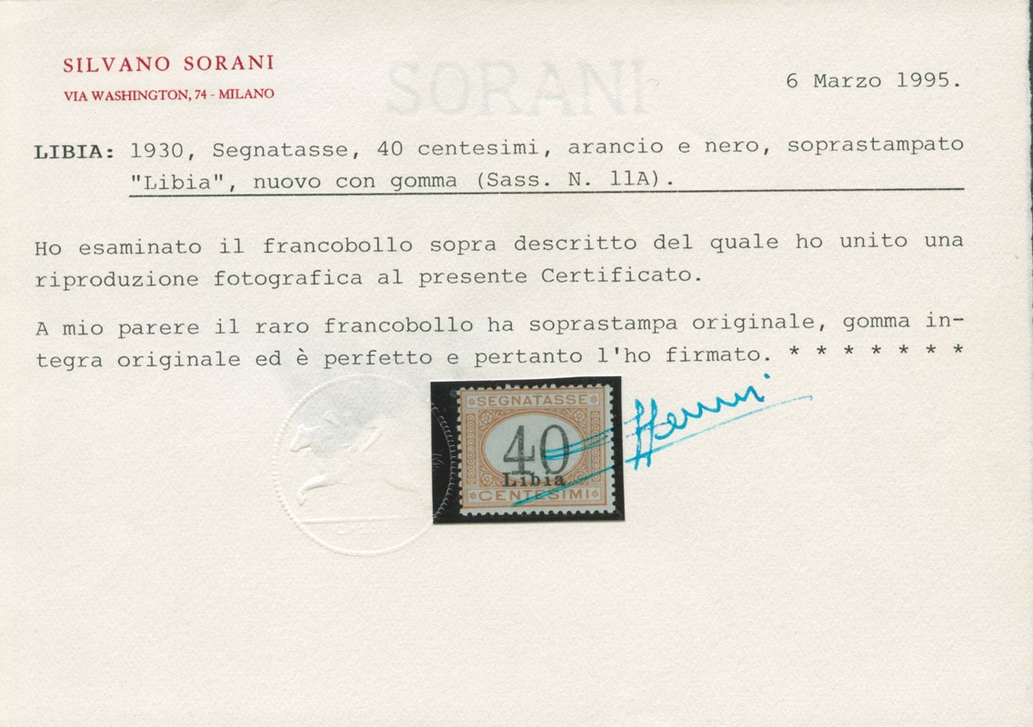 1930 - Libia: Segnatasse 20c arancio e nero, SL. Solo cento esemplari stampati, venduti a Bengasi nel 1930. CF Bottacchi e Sorani (Sassone T11A - Euro 22.000)