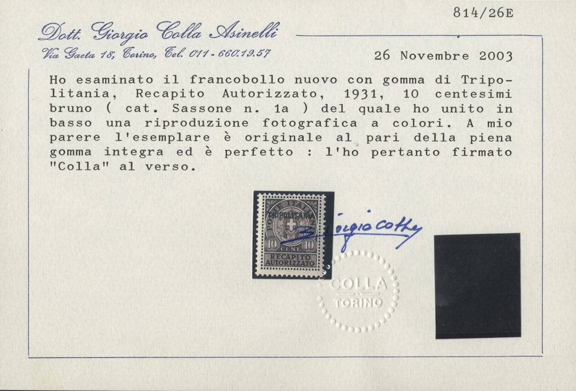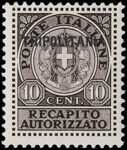 1931 - Tripolitania: Francobollo di recapito d'Italia soprastampato, 10c bruno, SL. CF Colla (Sassone 1a - Euro 3.000)