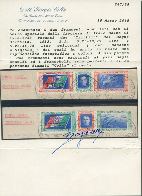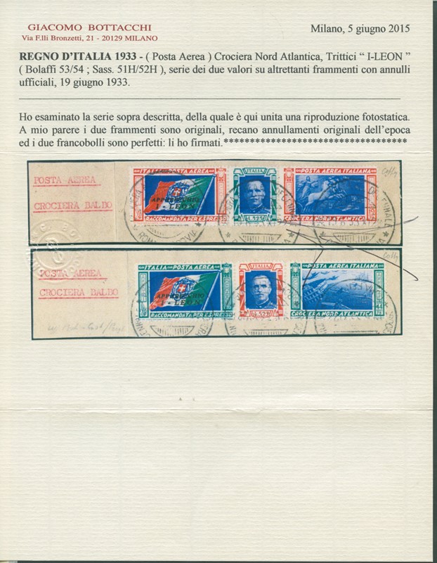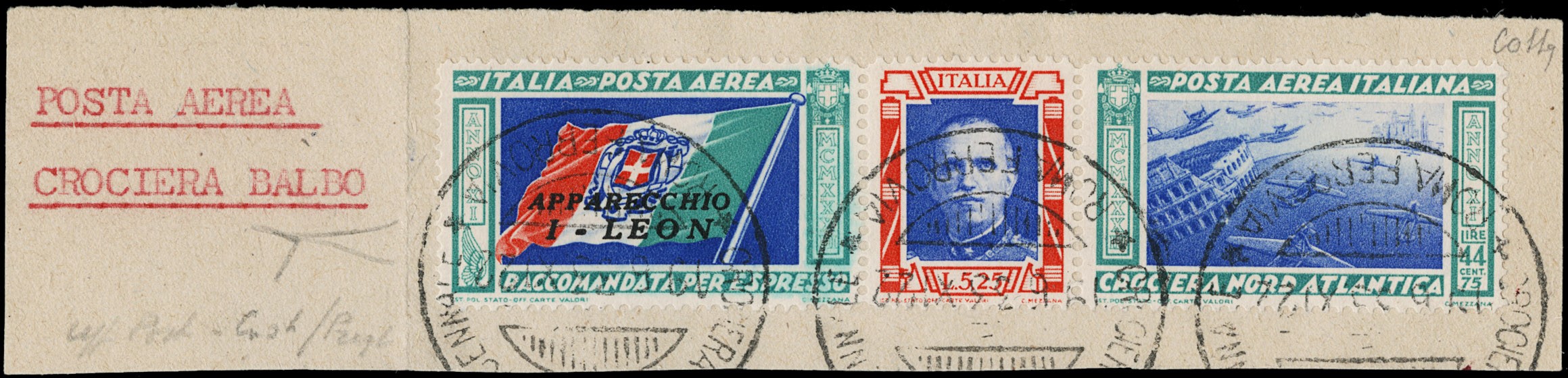 1933 - Crociera Nord Atlantica, i due valori 'I-LEON' su due diversi frammenti con gli annulli ufficiali del volo. CF Colla e Bottacchi (Sassone 51H+52H - Euro 5.000)