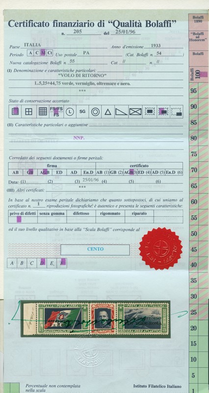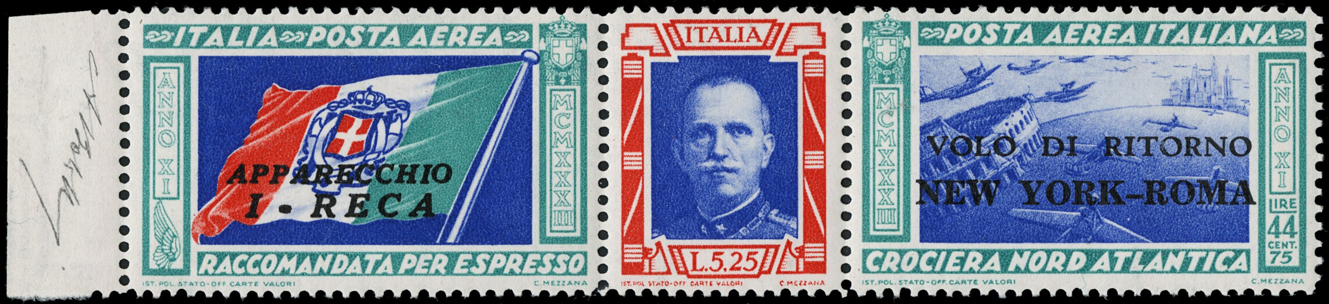 1933 - Crociera Nord Atlantica, Volo di Ritorno New York - Roma, trittico 'I-RECA' BdF, ben centrato e SL. CF finanziario Bolaffi 100% e firma Giulio Bolaffi (Sassone PA53 - Euro 67.500+)