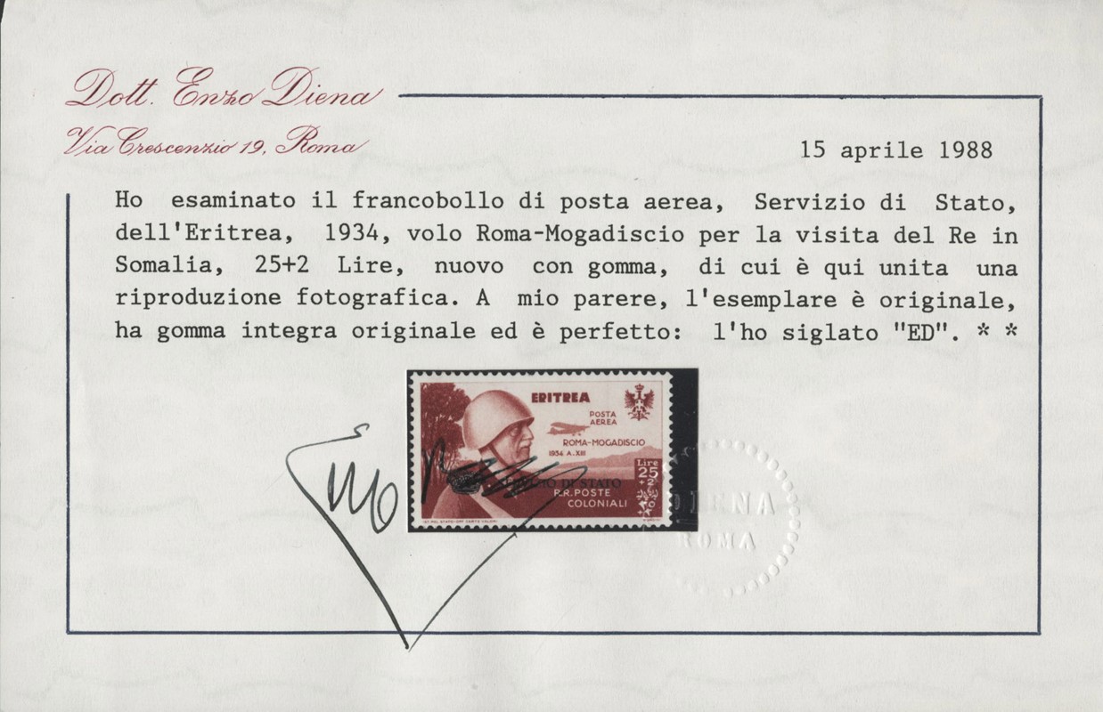 1934 - Eritrea: 25L+ 2L carminio bruno 'Coroncina', SL. CF E.Diena (Sassone SA1 - Euro 7.000)