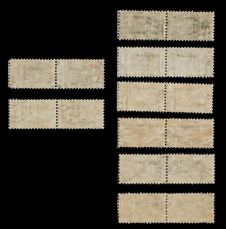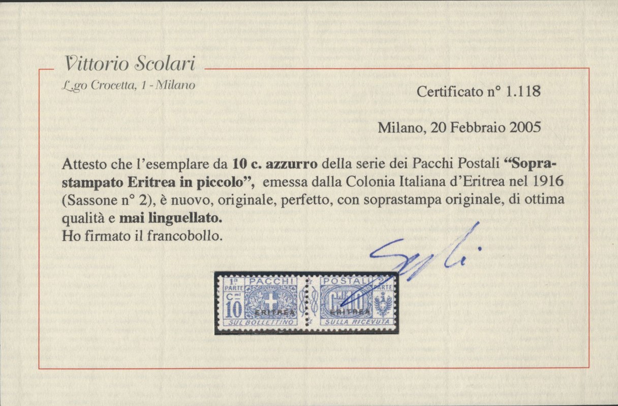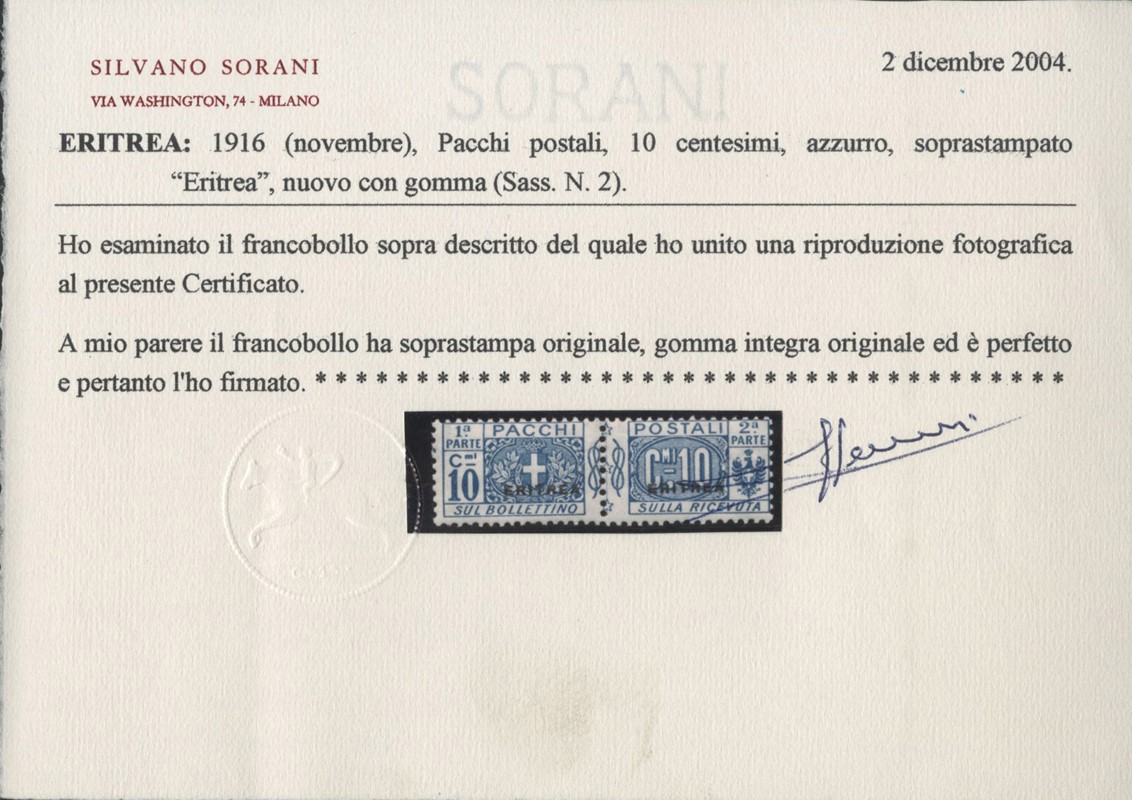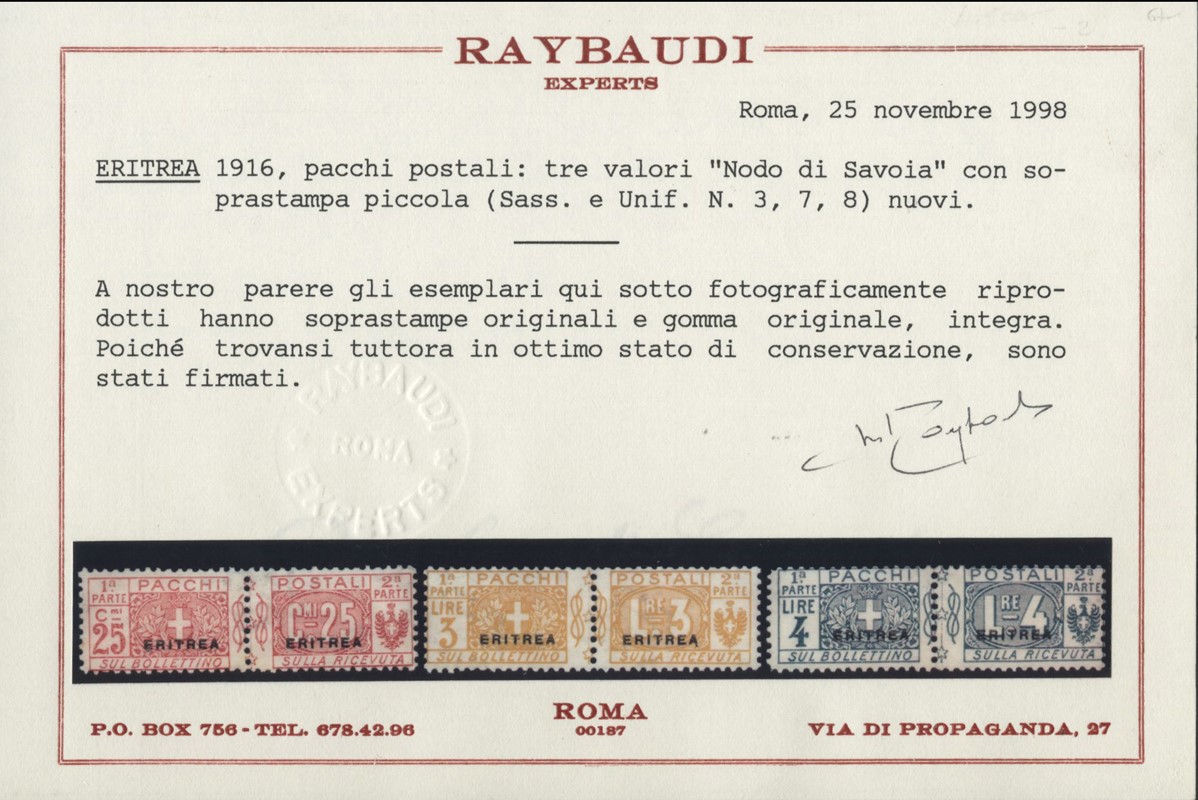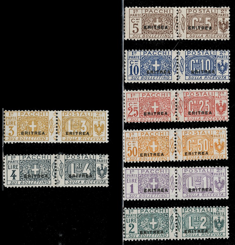 1934 - Eritrea: Pacchi Postali soprastampati 'ERITREA', la serie completa di otto valori, tutti SL. CF Sorani e Scolari per il 10c, Raybaudi per il 25c, il 3L e il 4L (Sassone PP1/8 - Euro 16.000)