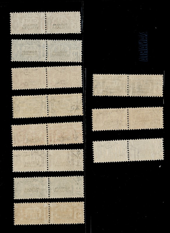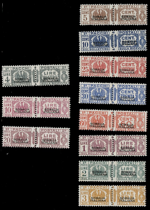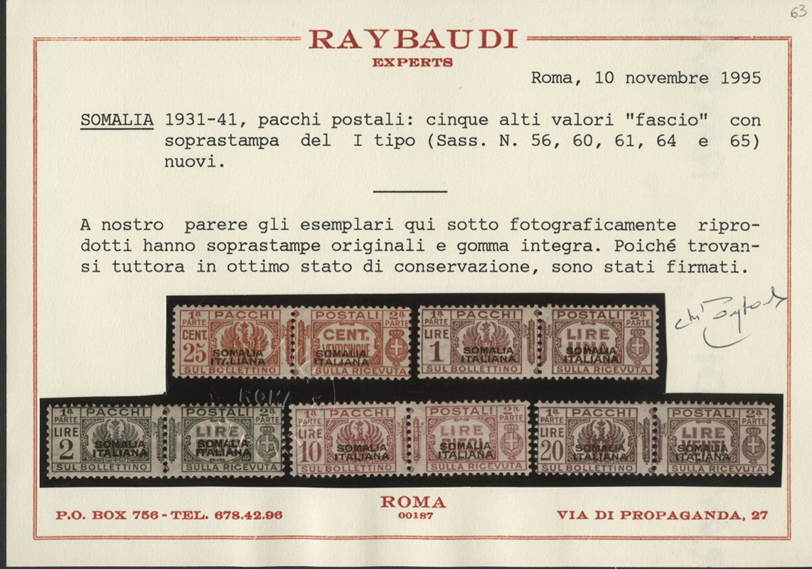 1937 - Somalia: Pacchi Postali con soprastampa del I tipo, la serie completa di 11 valori. CF Raybaudi per i cinque alti valori (Sassone PP54/57+59/65 - Euro 8.000)