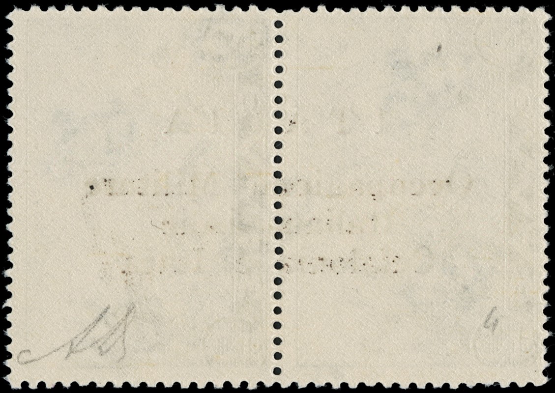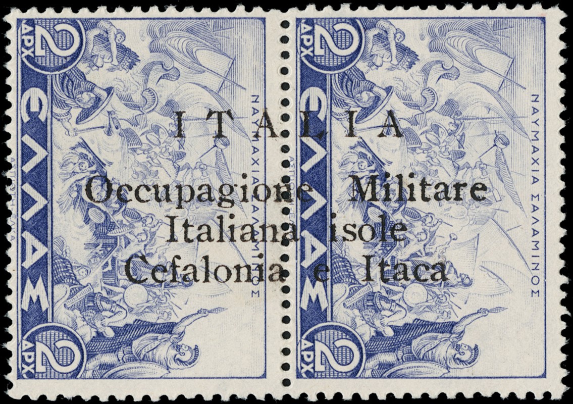 1941 - Cefalonia e Itaca, emissione di Argostoli, soprastampa a macchina, Serie Mitologica del 1937/38 2+2d oltremare, coppia SL con soprastampa nera, pos.3/II/ 2° stato. Sigla A.Diena (Sassone 4 - Euro 4.000)