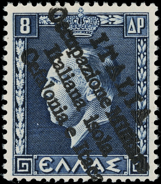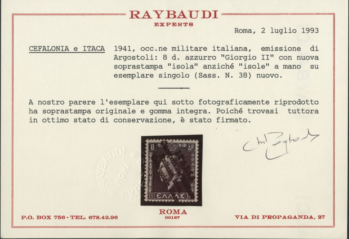 1941 - Cefalonia e Itaca, emissione di Argostoli, soprastampa a mano, Giorgio II 8+8d azzurro, esemplare singolo TL con soprastampa 'isola' al posto di 'isole'. CF Raybaudi (Sassone 38 - Euro 4.000)