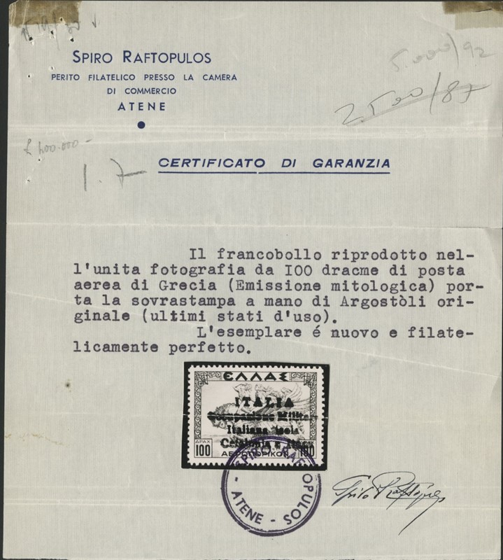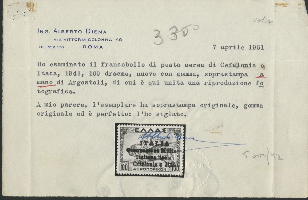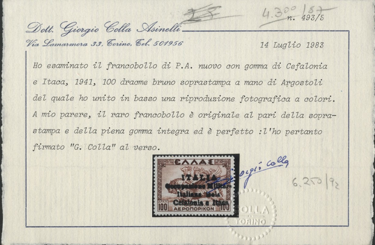 1941 - Cefalonia e Itaca, emissione di Argostoli, soprastampa a mano, Posta Aerea 100d bruno, esemplare singolo SL con soprastampa 'isola' al posto di 'isole'. Raro, CF Colla, A.Diena e Raftopulos (Sassone PA23 - Euro 48.000)