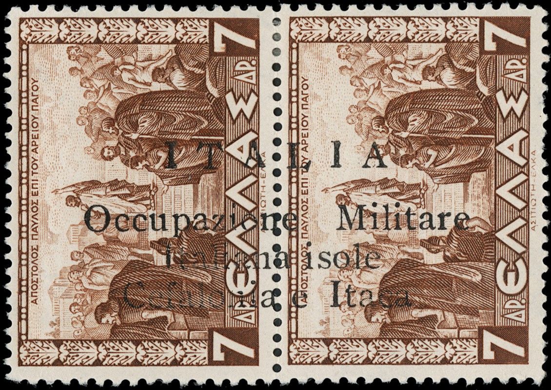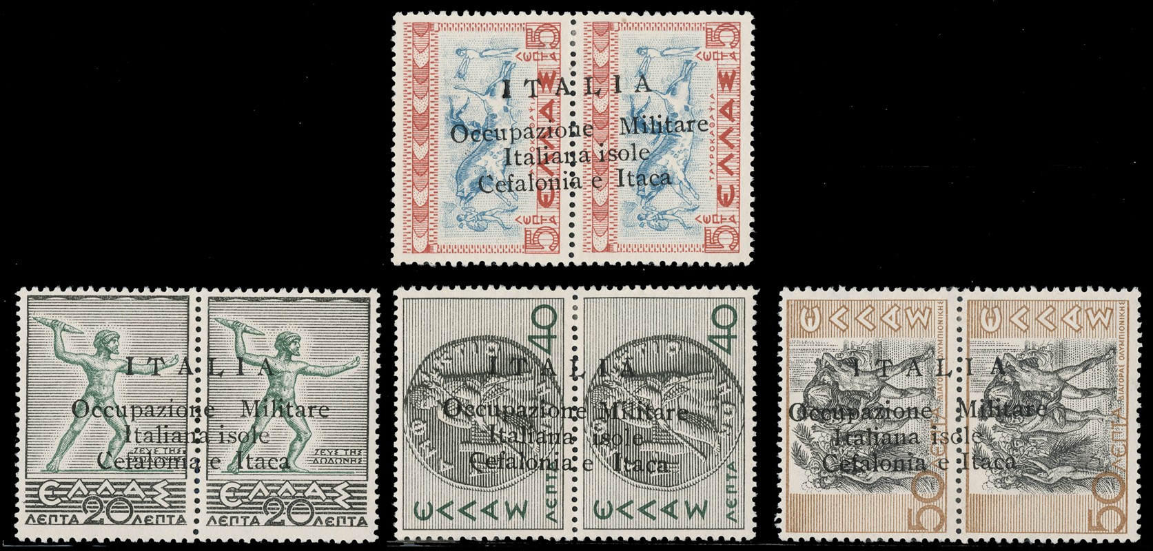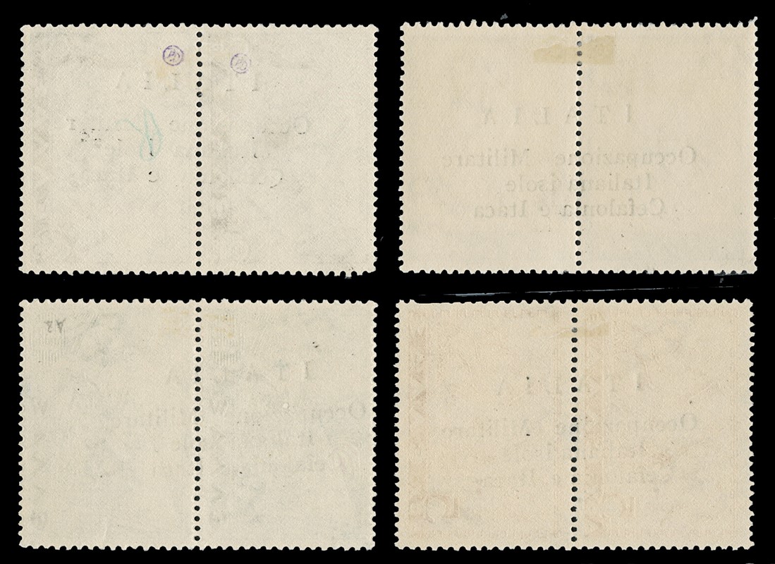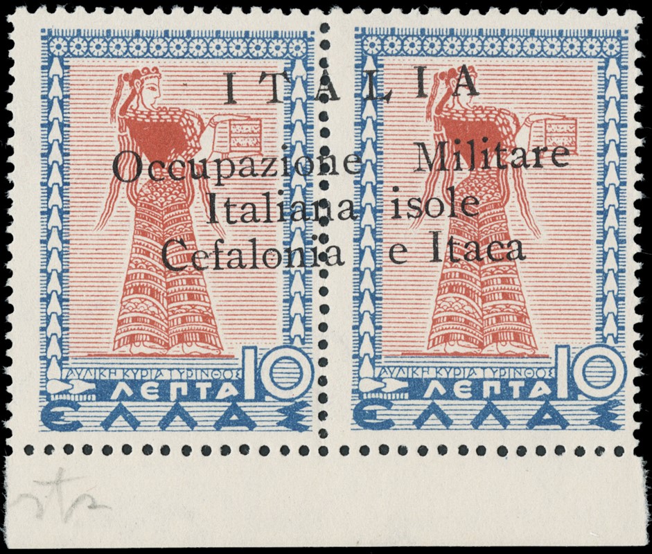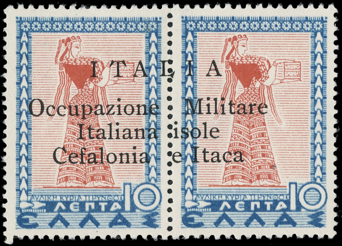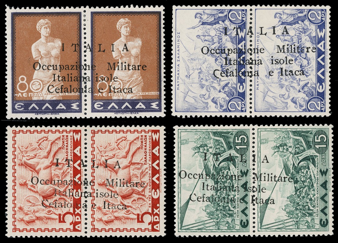 1941 - Cefalonia e Itaca, emissione di Argostoli a macchina, serie 'Mitologica' del 1937/38 in coppie con soprastampa nera, nuova con gomma TL quasi completa, mancano i n.6+6d, il n.25+25d e' usato. Tutti i pezzi sono corredati di plattatura (Sassone 11/18+20+22+12A+23 - circa Euro 4.170)