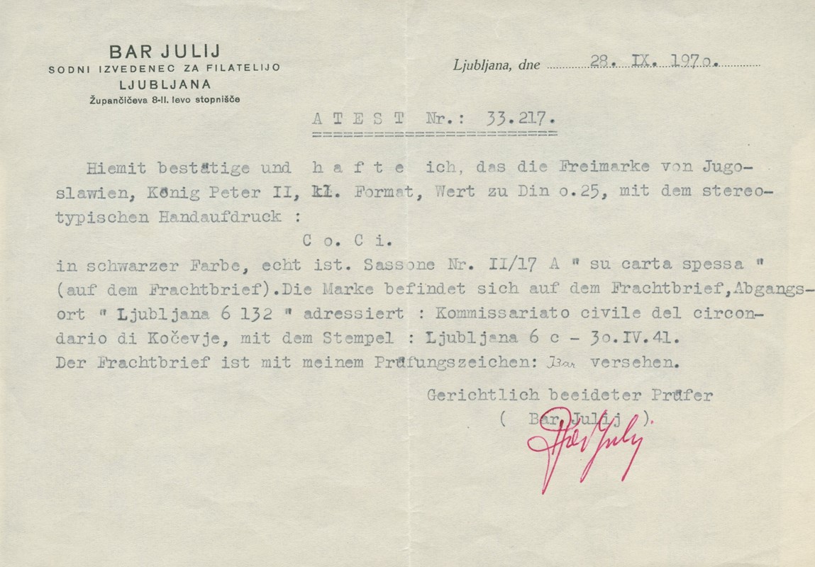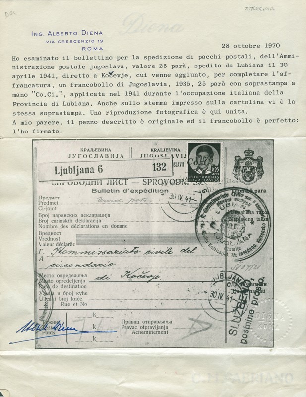 1941 - Lubiana: francobolli di Jugoslavia, 25p bruno nerastro, soprastampa a mano, su bollettino pacchi da 'LJUBLJANA 30.IV.41-'. CF A.Diena e Bar Julij (Sassone 1A - Euro 20.000)
