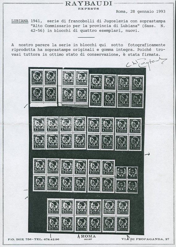 1941 - Lubiana: francobolli di Jugoslavia del 1935/6 e del 1939 soprastampati 'Alto Commissario per la Provincia di LUBIANA' SL. CF Raybaudi (fotocopia - ex BL4) (Sassone 42/56 - Euro 16.000)