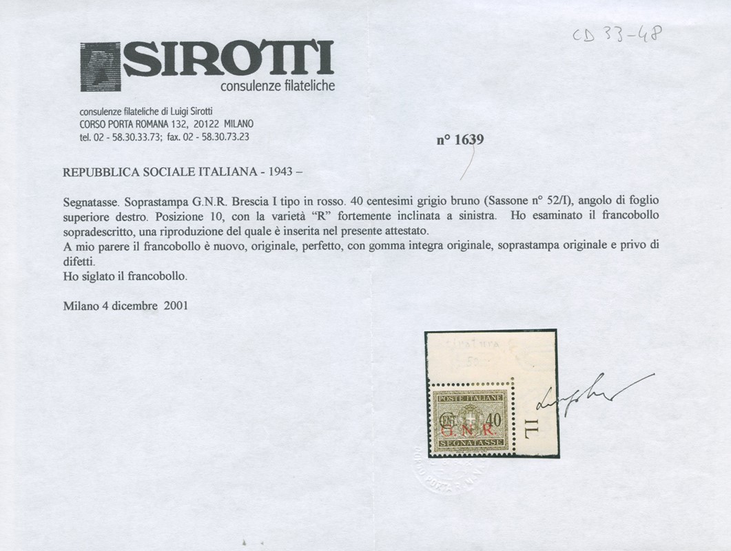 1943 - GNR, Segnatasse, 40c grigio bruno, soprastampa del I tipo, AdF, con “R' inclinata a sinistra, SL. CF Sorani (Sassone T52/Ie - Euro 4.200+)