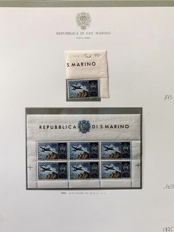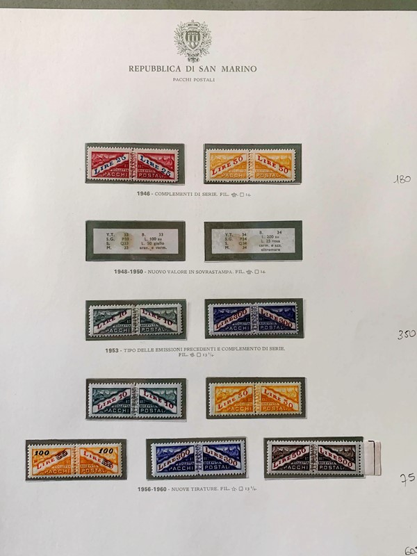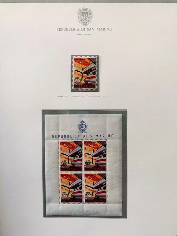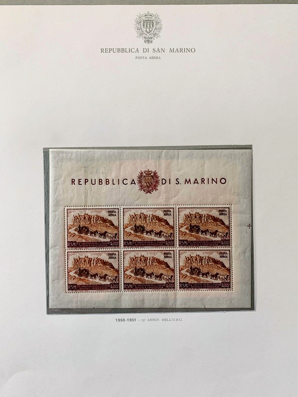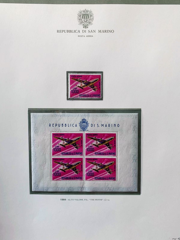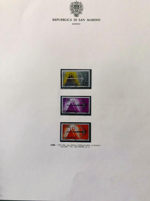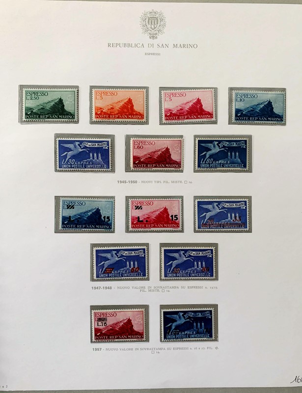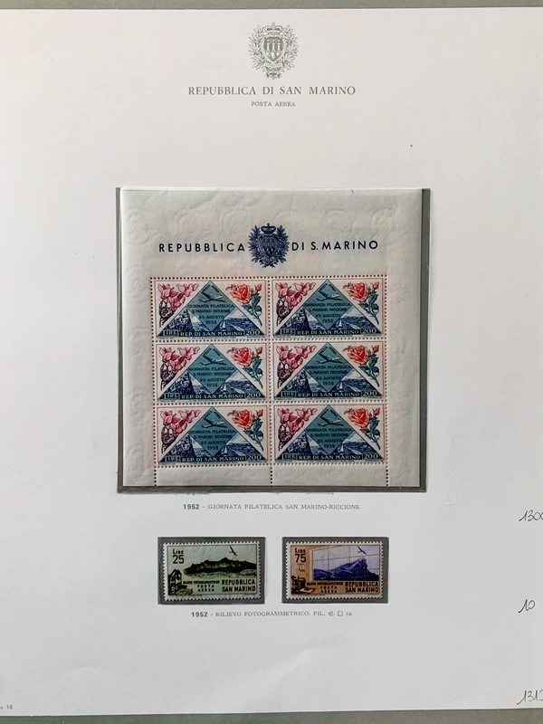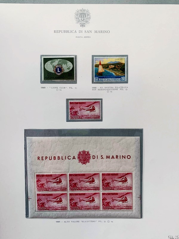 1943/82 - SAN MARINO: collezione quasi completa di francobolli del periodo, praticamente tutti SL, completa di PO, PA ed espressi. Presenti PP, tasse, foglietti e blocchi fogli tranne i rari; il tutto montato su fogli GBE in tre album, l'ultimo con le novita' non conteggiate del valore di catalogo. 1 CF. Occasione (Sassone circa Euro 19.000)