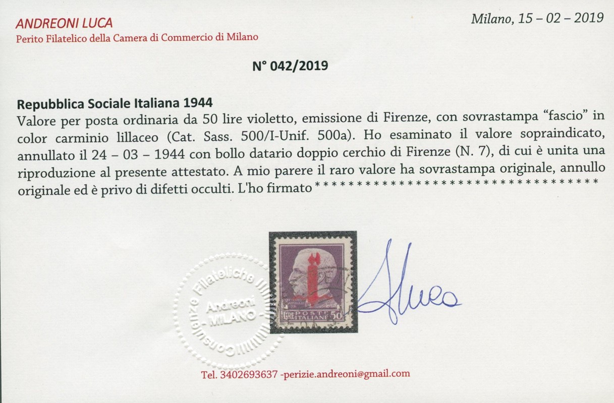 1944 - 50L violetto con soprastampa 'fascetto' in carminio lillaceo, tir. Firenze, annullato il '24-03' 1944 a Firenze. Raro. CF Andreoni e Bottacchi (Sassone 500/I - Euro 20.000)