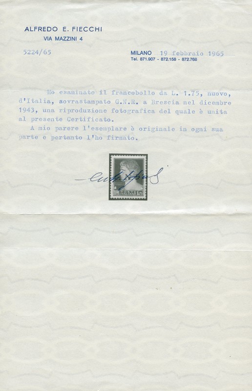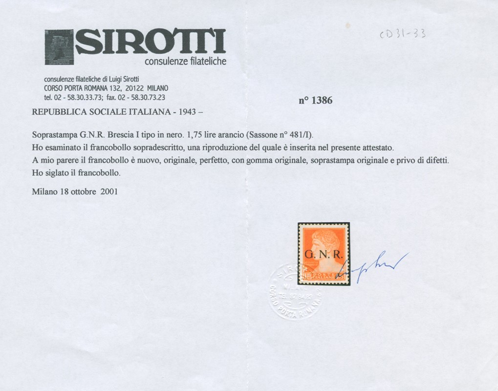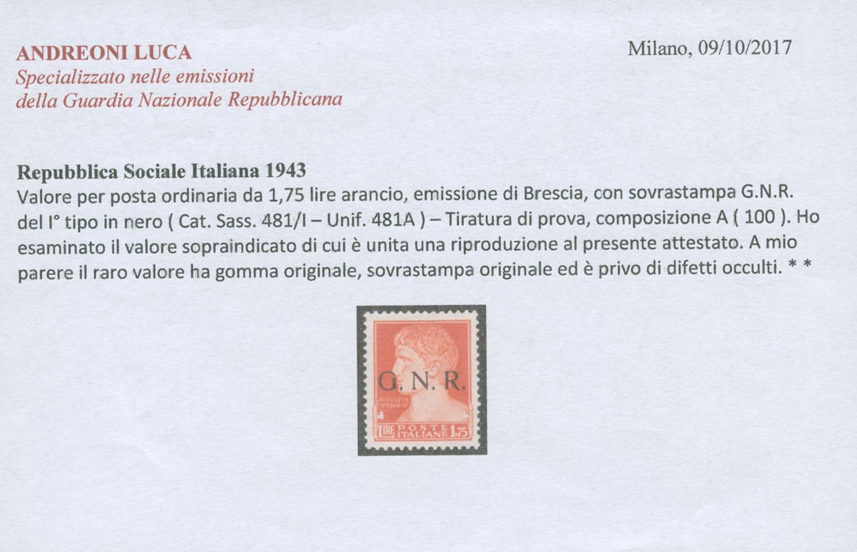 1944 - GNR, 1,75L arancio, soprastampa di Brescia del I tipo. Firma Oliva, CF Andreoni, Fiecchi e Sirotti (Sassone 481/I - Euro 16.000)