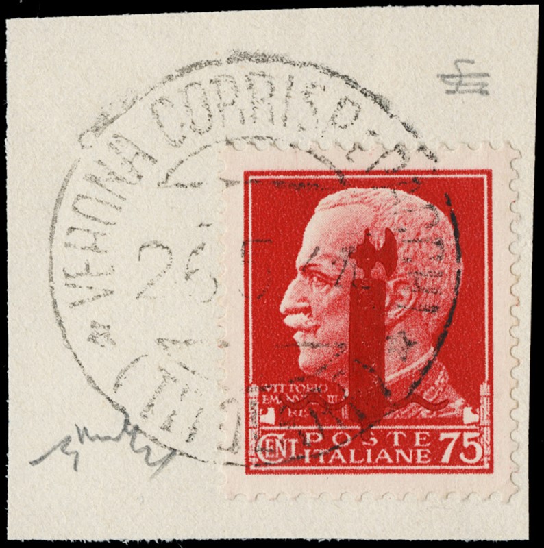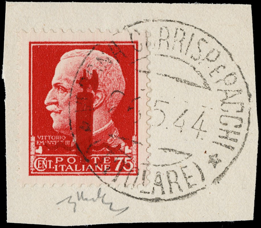 1944 - RSI: tre frammenti affrancati con 75c carminio con scambio di soprastampa: fascetto rosso anziche' nero. Insieme di ottima qualita', non catalogati come usati. Sigla Chiavarello (Sassone 494BA - Euro 3.600 quotazione solamente SL**)