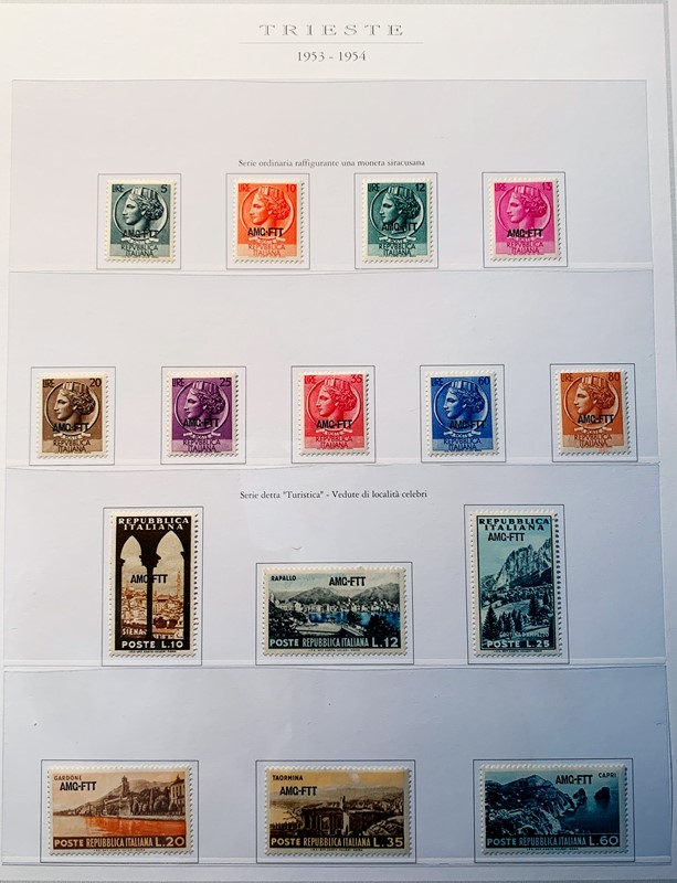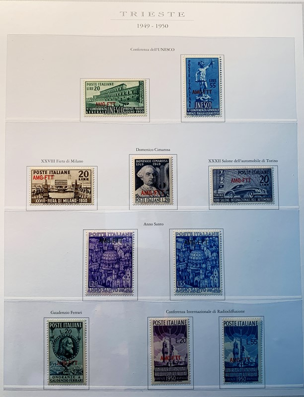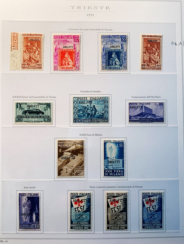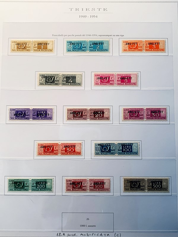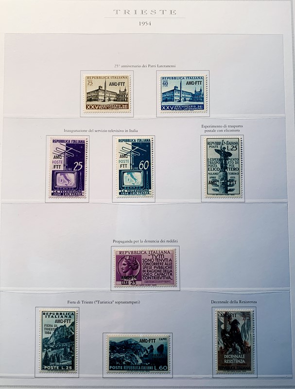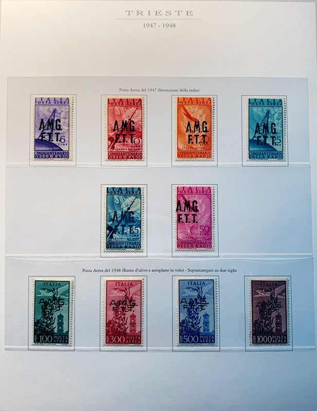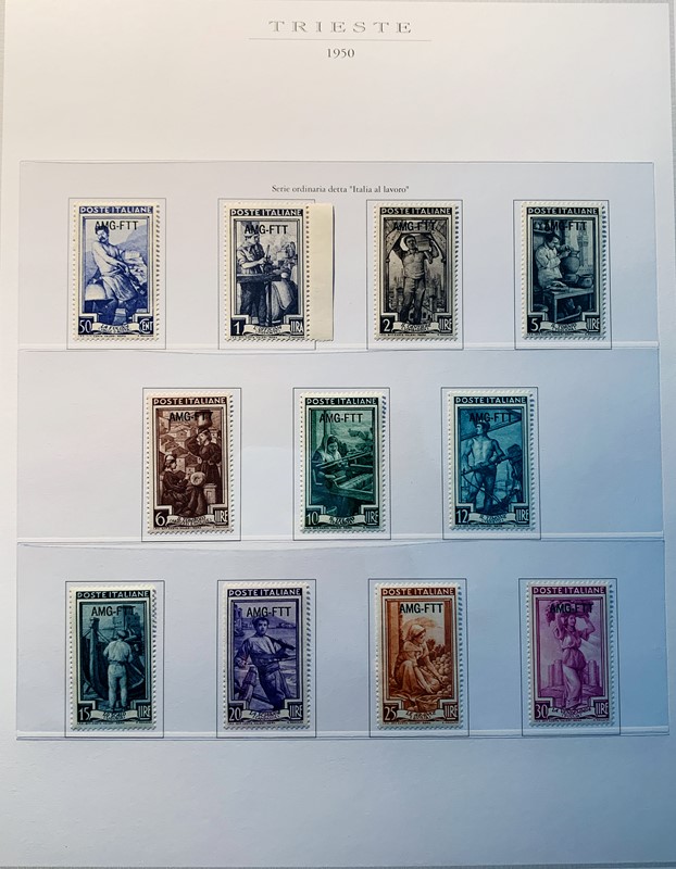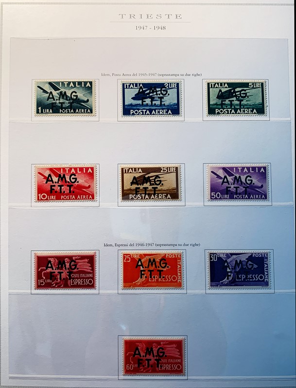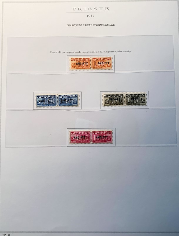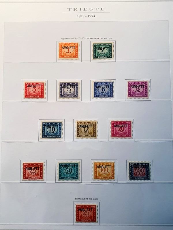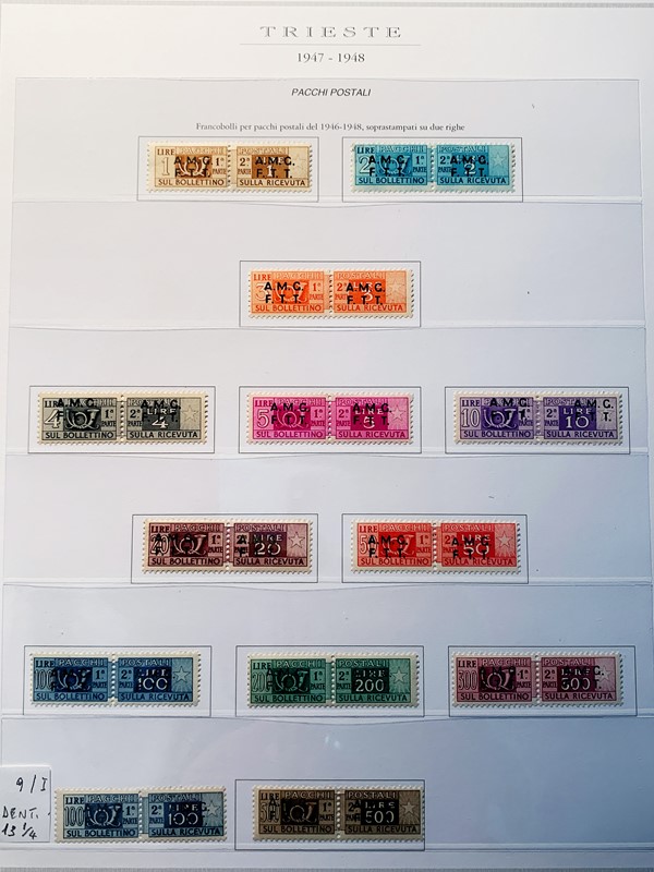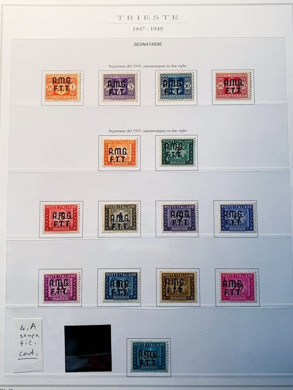 1945/54 - TRIESTE A: collezione completa di francobolli nuovi prevalentemente SL, comprendente i Servizi, incluse le nuove soprastampe del 50L PA e del 25L Tasse. Notati il 100L Pacchi Postali dent.13 1/4 e una quartina del Cavallino (Sassone oltre Euro 1