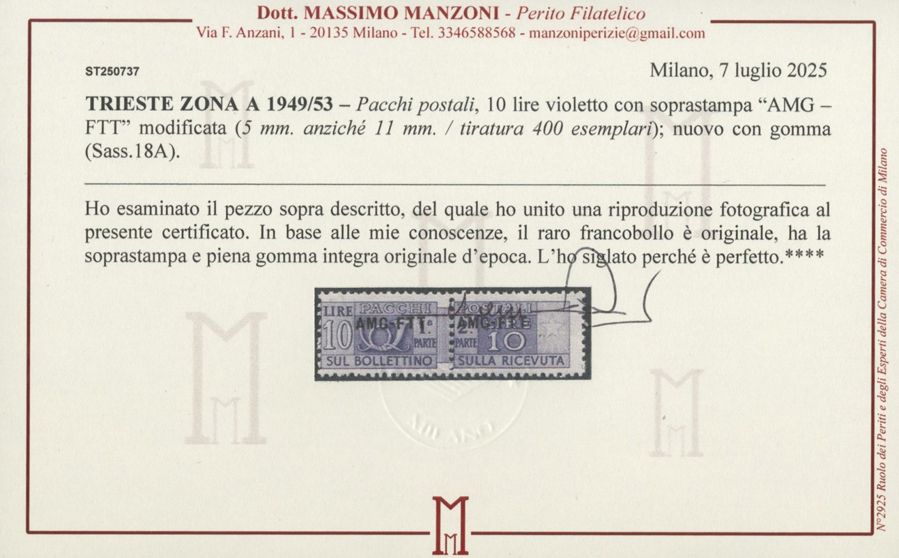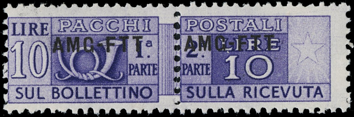 1949 - Pacchi Postali, 10L violetto con soprastampa modificata, 5,5mm invece di 11mm. Tiratura 400 esemplari. Firma Renato Mondolfo e CF Manzoni (Sassone PP18A - Euro 3.200)