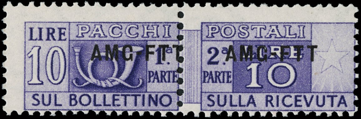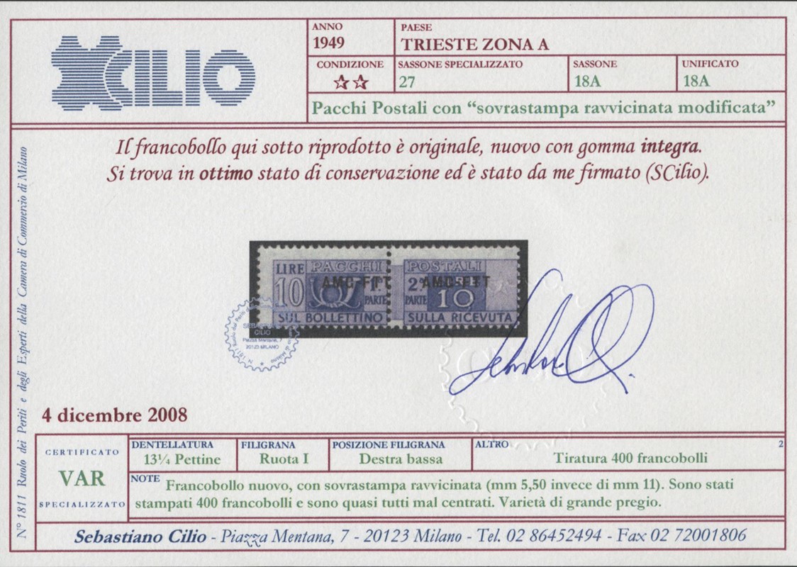 1949 - Pacchi Postali, 10L violetto con soprastampa modificata, 5,5mm invece di 11mm. Tiratura 400 esemplari. CF Cilio (Sassone PP18A - Euro 3.200)