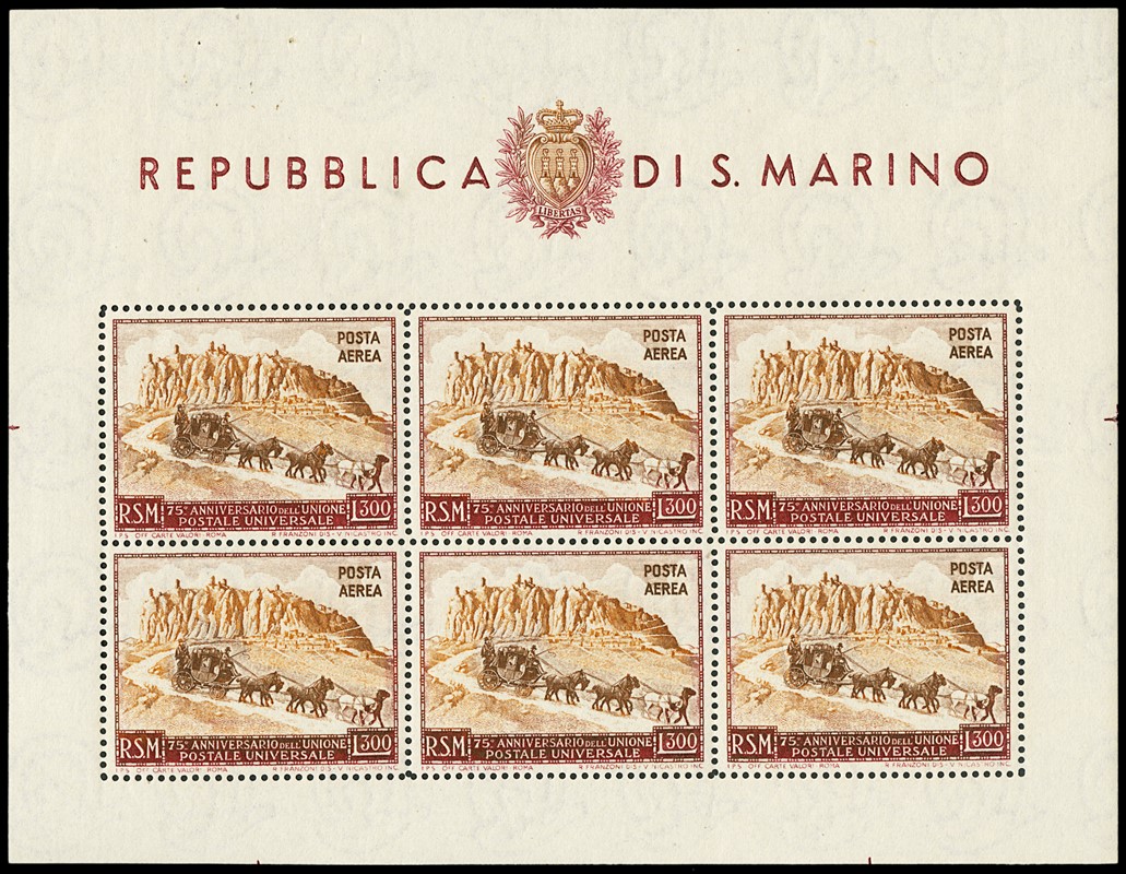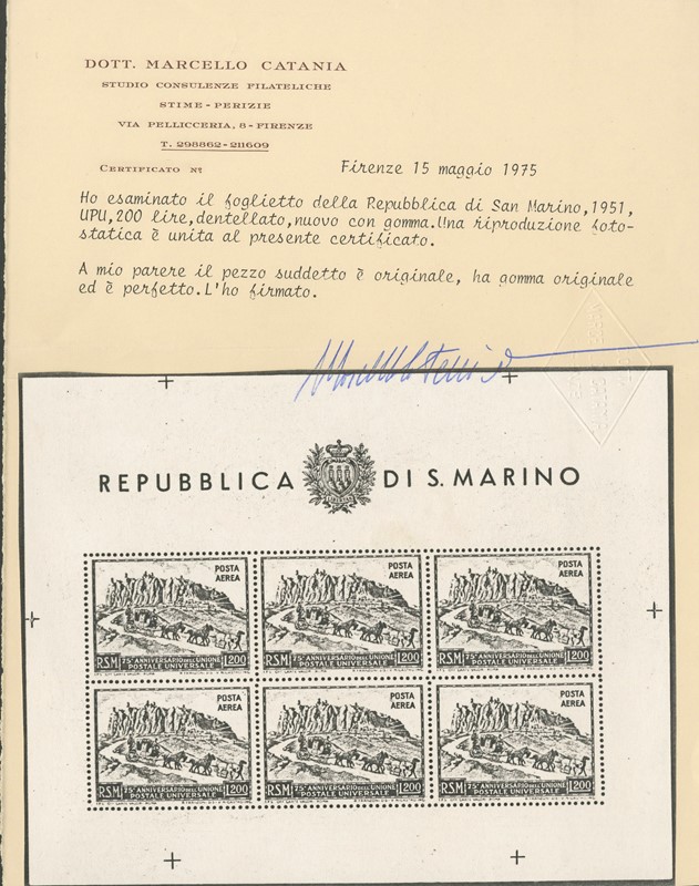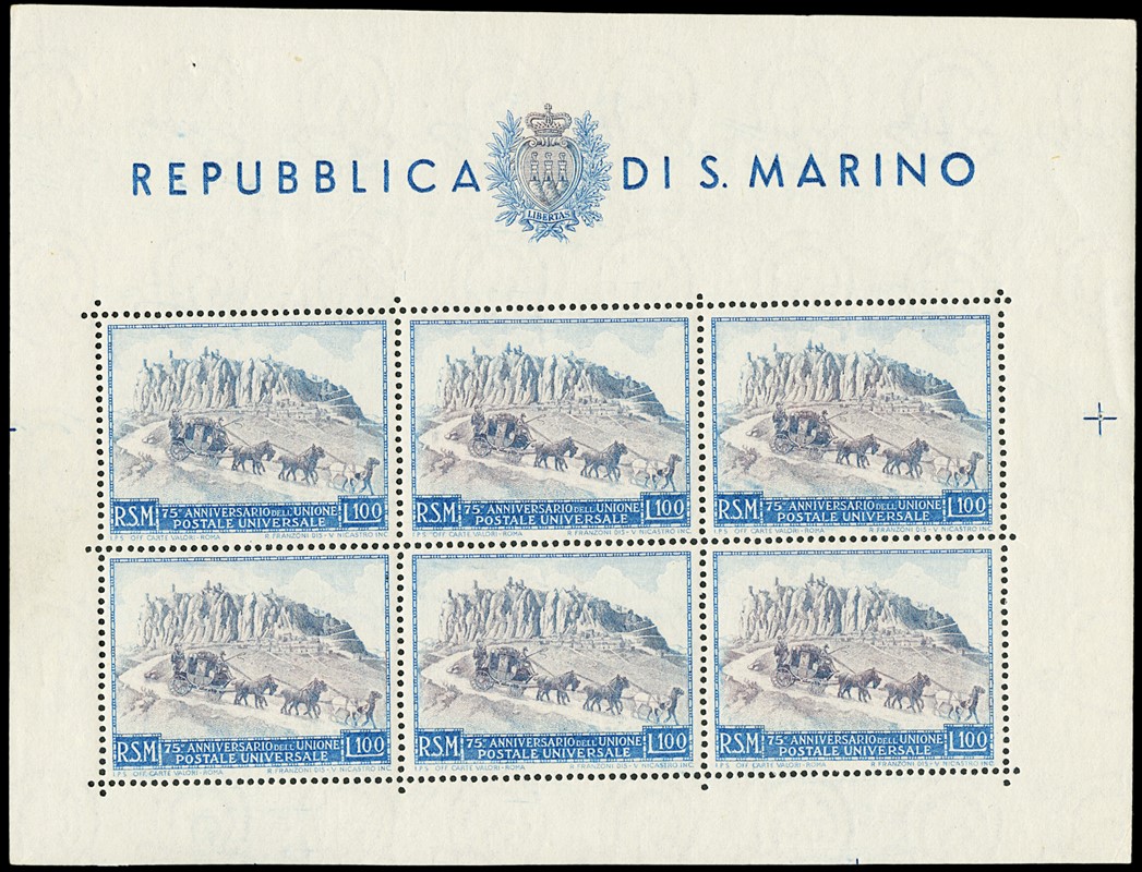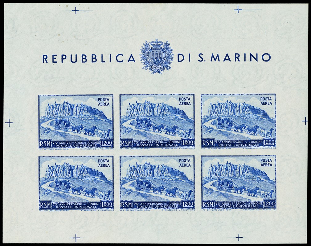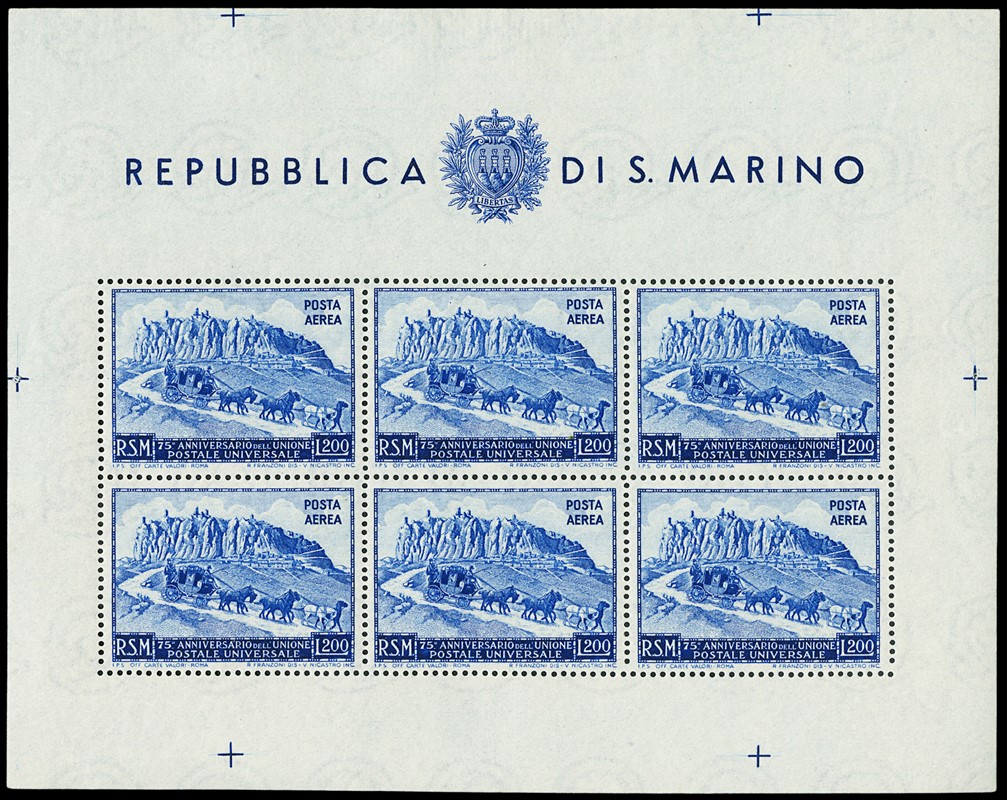 1949/51 - 75° Anniversario dell'UPU, i quattro foglietti: 100L celeste, 200L azzurro, 100L rosso e bruno, 200L azzurro non dentellato. CF Catania (Sassone FO8+9+10+11 - Euro 1.335)