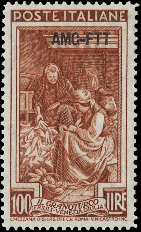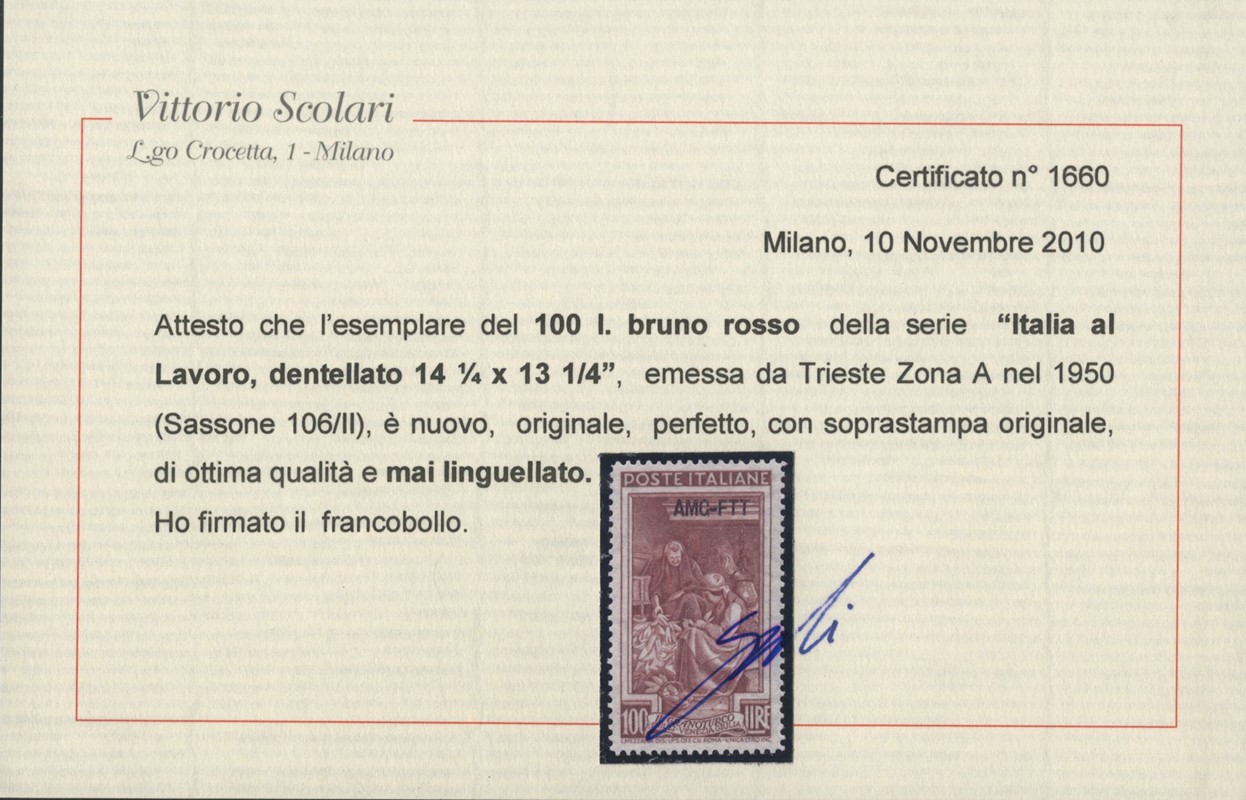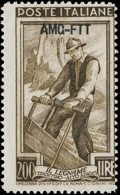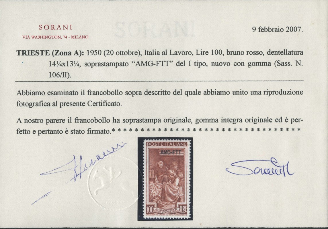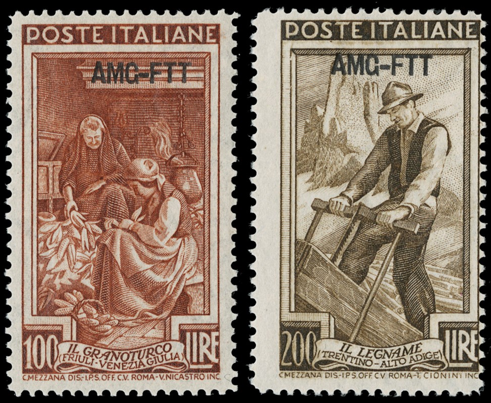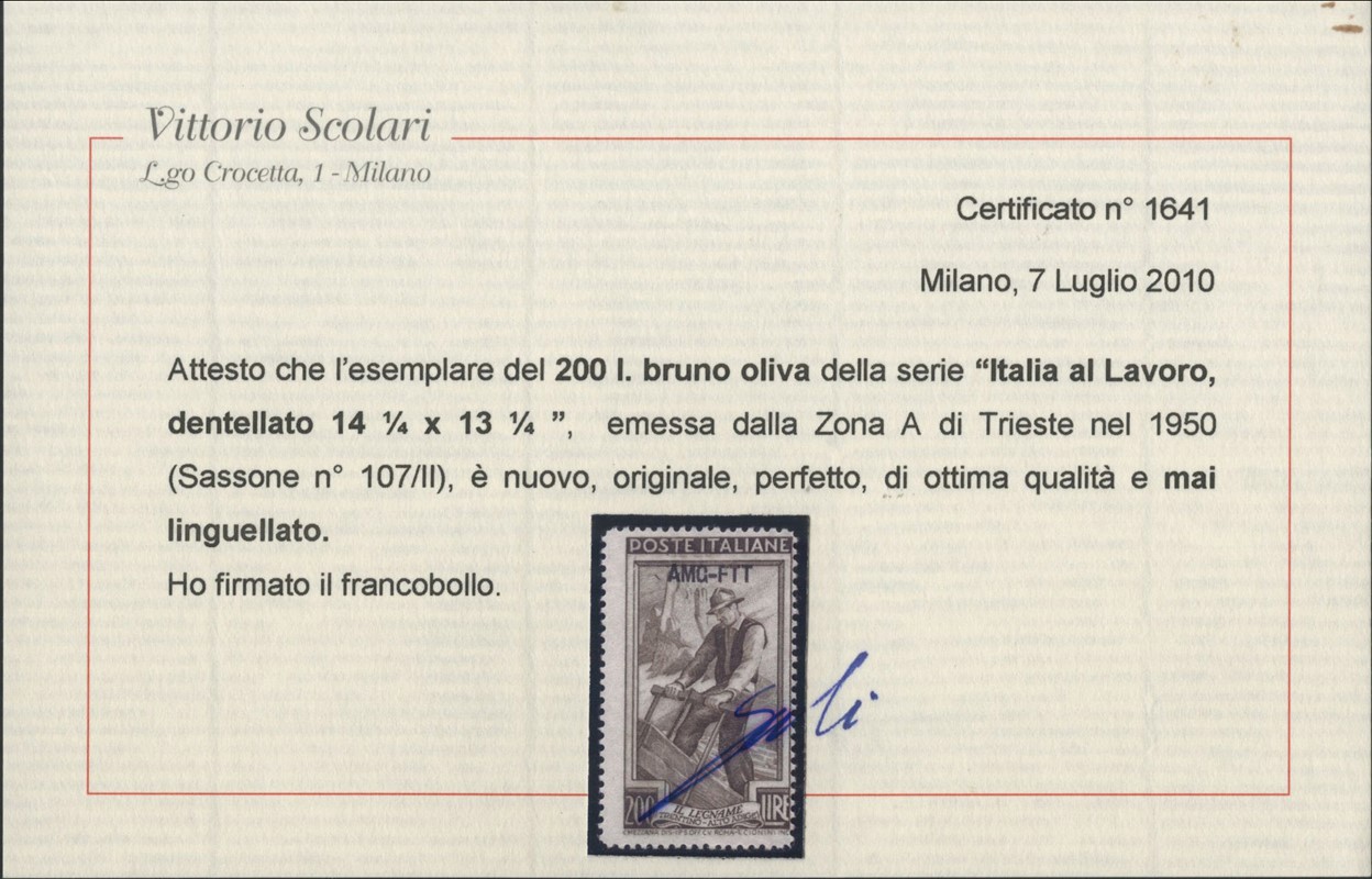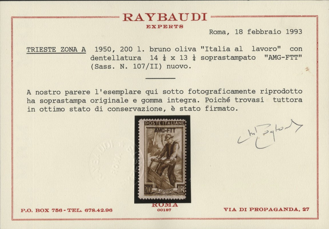 1951 - Italia al lavoro, 100L e 200L soprastampati 'AMG-FTT' con dentellatura 141/4x131/4. Il 100L con trattino lungo. CF Sorani per il 100L, Raybaudi per il 200L, Scolari per entrambi i valori (Sassone 106/II+107/II - Euro 6.600)