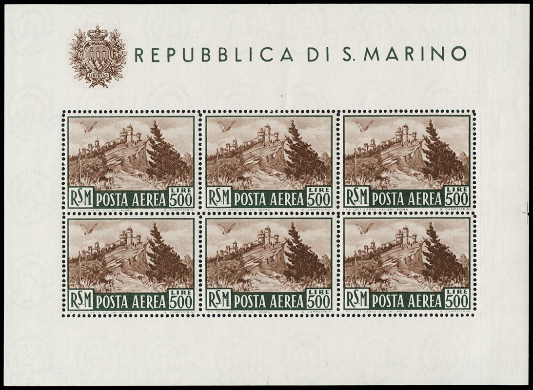 1951 - Vedute 500L verde scuro e bruno, foglietto di sei esemplari SL e molto ben centrato (Sassone FO12 - Euro 5.000+)