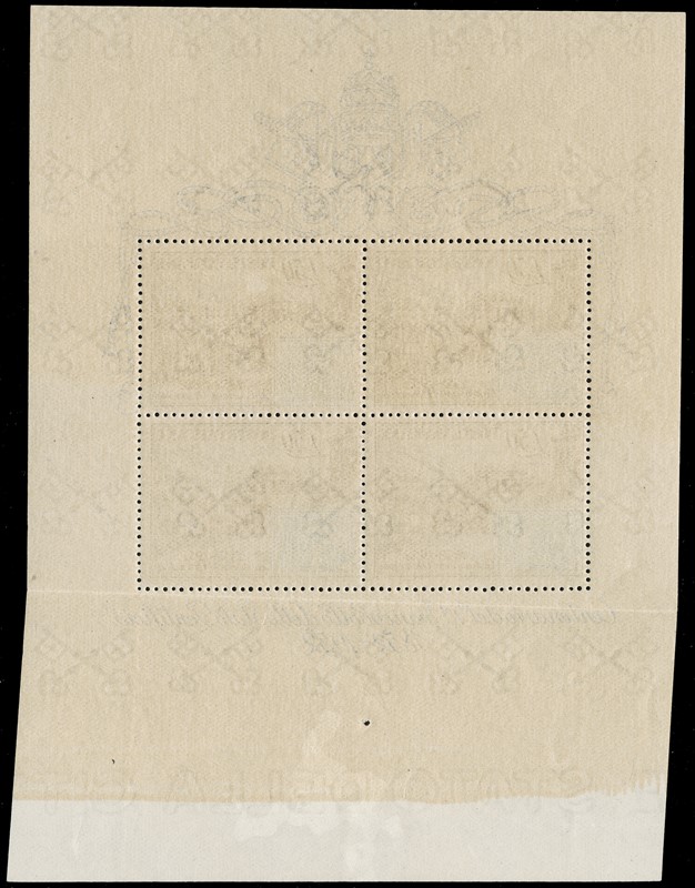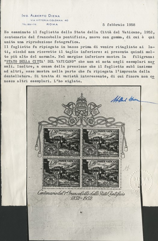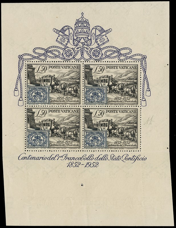 1952 - Centenario dei francobolli dello Stato Pontificio, 50L nero e azzurro, il foglietto di quattro esemplari. Parte inferiore ripiegata per consentire il taglio ai lati e non ritagliata, risultando in un foglietto molto piu' alto del normale, recante i