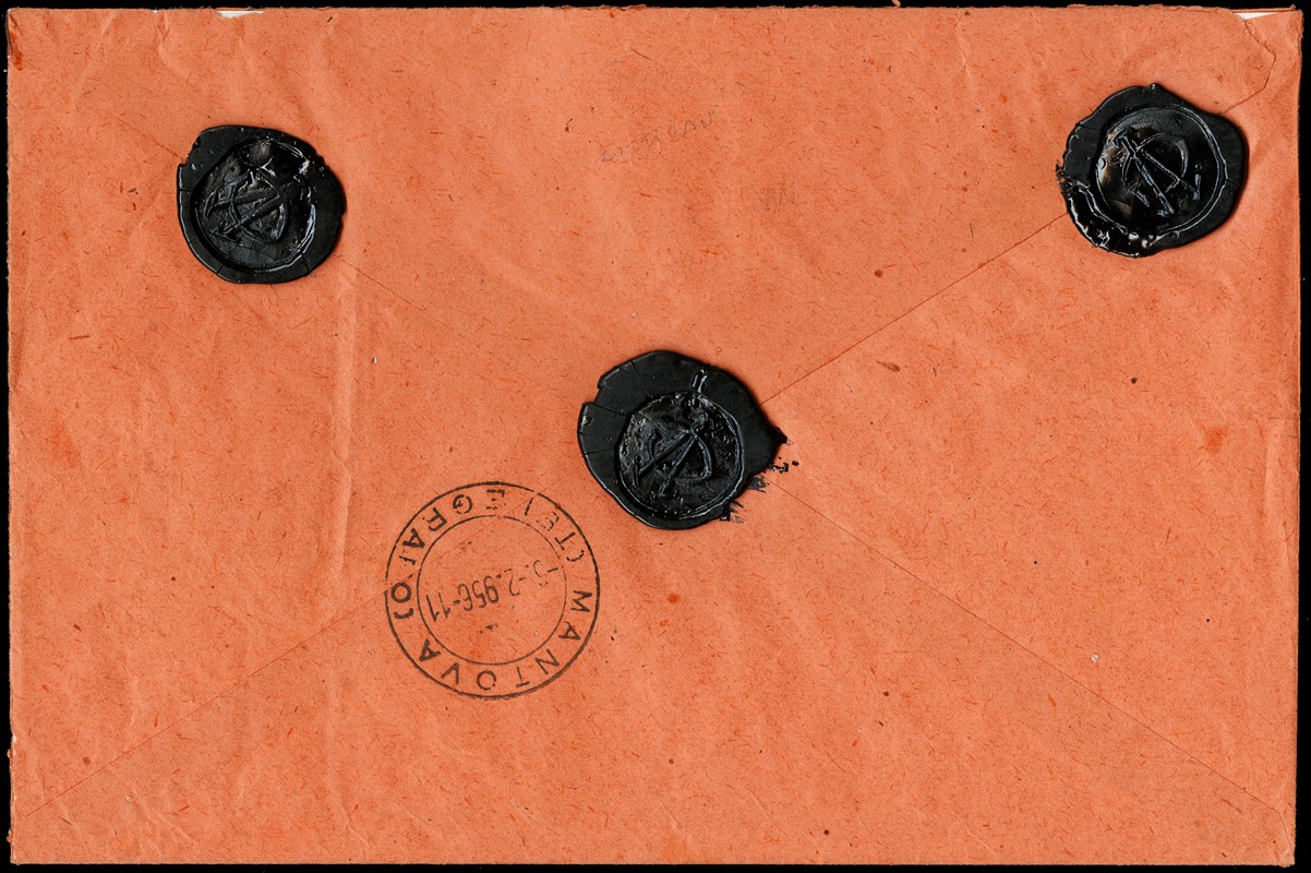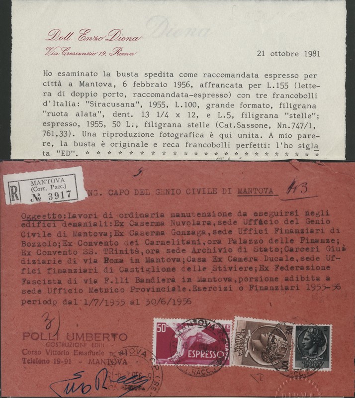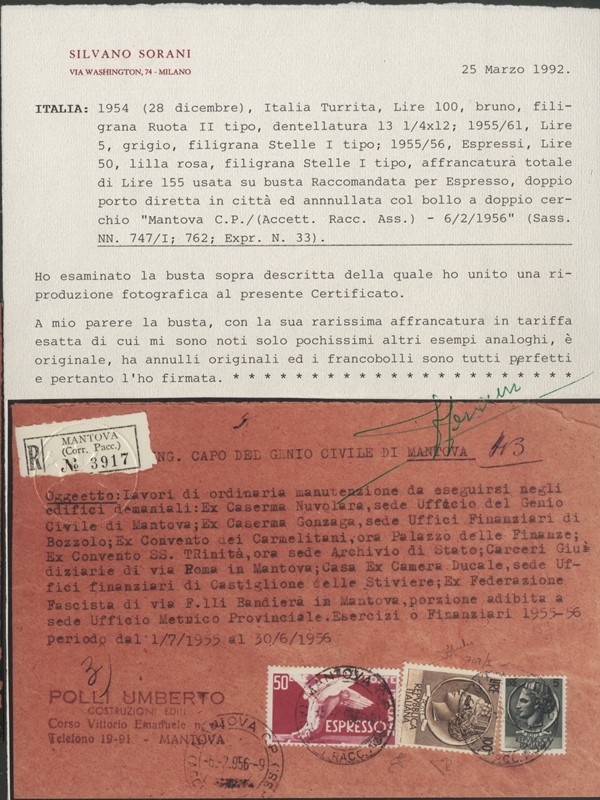 1954 - Italia Turrita, 100L bruno, filigrana ruota II tipo dent. 13 1/4x12, 5L grigio, filigrana stelle I tipo, ed Espressi 50L lilla rosa, in tariffa esatta di Lire 155 su Raccomandata da 'MANTOVA C.P. (Accet. Racc. Ass.) -6.-2.956' per citta'. Rarita', CF E.Diena e Sorani (Sassone 747/I+762+E33 - Euro - )