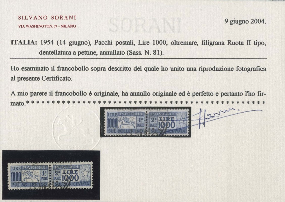 1954 - Pacchi Postali, 1000L oltremare, filigrana Ruota II tipo, dentellatura a pettine 'Cavallino', usato. CF Sorani (Sassone PP81 - Euro 4.000)